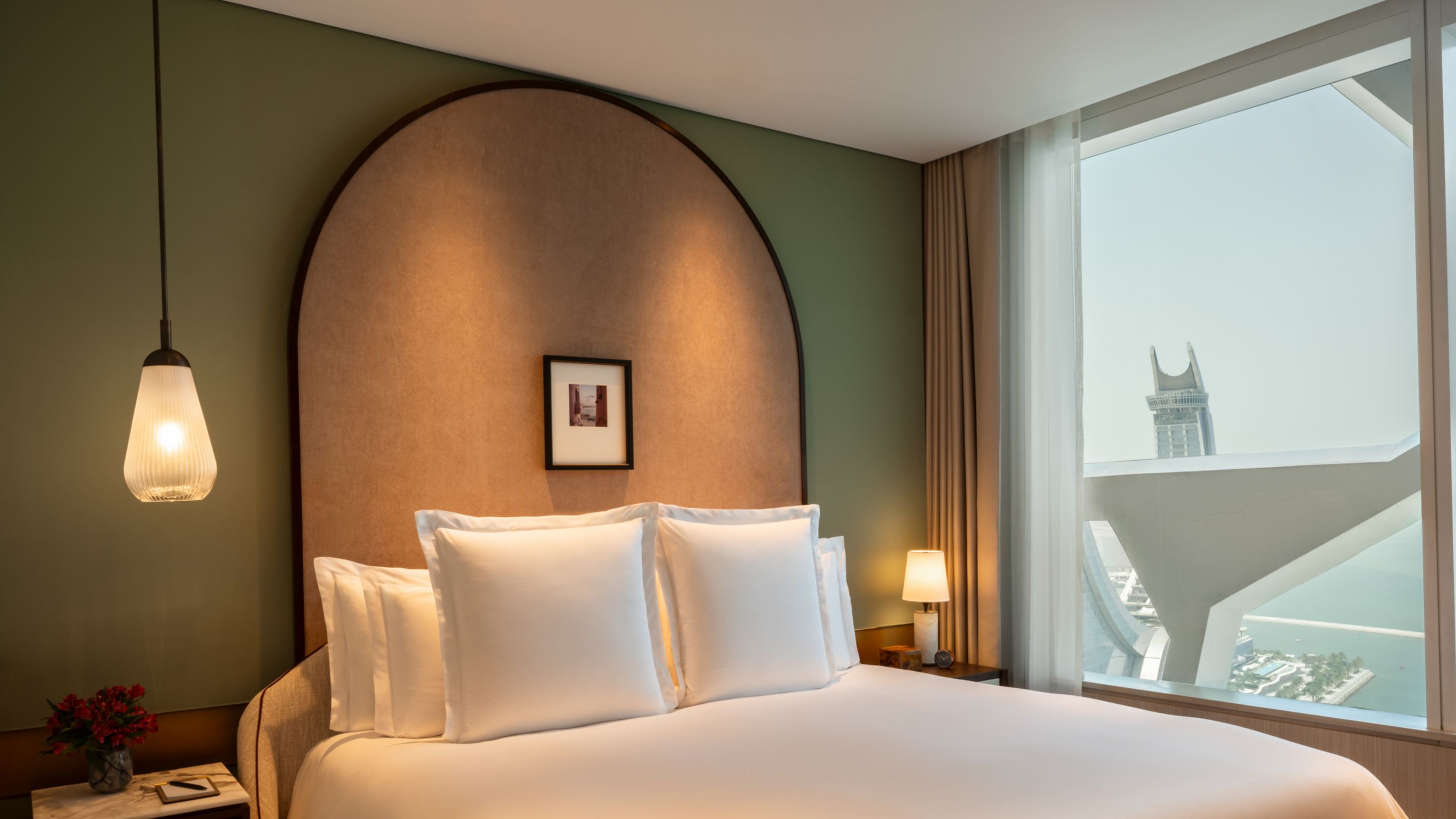 تقدّم كل شقة من شققنا الفاخرة المكوّنة من غرفة نوم واحدة مساحة معيشة تبلغ 85 مترًا مربعًا (915 قدمًا مربعة)، وقد صُممت بعناية فائقة لتجمع بين التراث القطري الأصيل ووسائل الراحة السكنية العصرية. تضم الشقة غرفة نوم رئيسية بسرير كينغ، وخزانة ملابس رحبة، وحمامًا فسيحًا، وحوضين أنيقين لغسل الوجه، ودشًا مطريًا منعشًا، وحوض استحمام عميقًا للاسترخاء. وتكتمل أناقة الشقة بمطبخ مفتوح مجهّز بأرقى الأجهزة المنزلية، وركن طعام أنيق يتّسع لأربعة أشخاص، مع إطلالات ساحرة على أفق لوسيل المتألق أو مياه الخليج العربي الزرقاء.