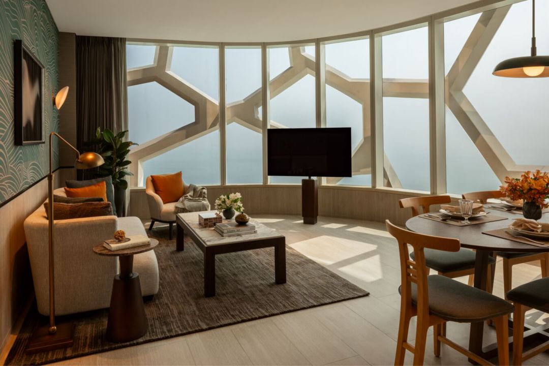 تحتفي الشقة المكوّنة من ثلاث غرف نوم بمفهوم الفخامة في ضيافة السماء، وتتزيّن بمزيج فريد يجمع بين التراث القطري الأصيل والتصميم العصري. وبمساحة تمتد إلى 177 مترًا مربعًا (1905 قدمًا مربعة)، تضم الشقة مساحة معيشة رائعة يكتمل جمالها بإطلالات آسرة على الخليج العربي أو أفق لوسيل المتألق، وغرفة طعام منفصلة بمقاعد تستوعب ثمانية أشخاص، ومطبخًا مجهزًا بأحدث التقنيات، وجناحًا رئيسيًا يضم خزانة ملابس واسعة، وحوضين، ودشًا كثيف القطرات، وحوض استحمام عميقًا. كما تتميز الغرفتان الإضافيتان (واحدة بسرير كينغ والأخرى بسريرين منفردين) بحمامات داخلية خاصة، بالإضافة إلى غرفة خادمة تأتي بحمامٍ خاص.