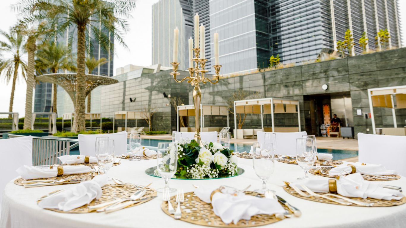 The Pool Terrace provides a stunning backdrop of the cityscape, offering a picturesque venue for weddings with its modern elegance and panoramic views.
