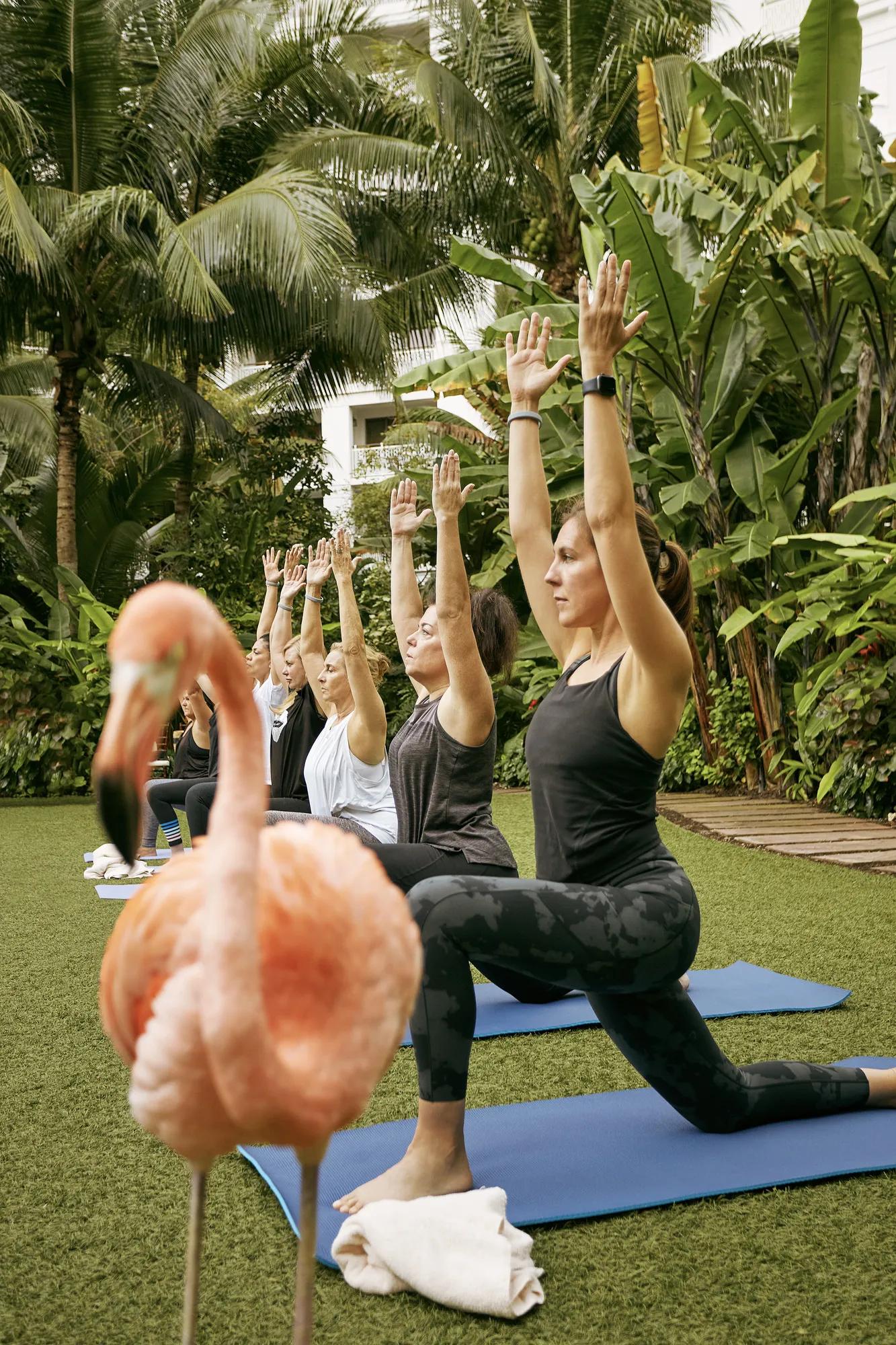 Every Sunday, hone your yoga moves in the Rosewood Garden with the ultimate experts of balancing on one leg – the Baha Mar flamingos.