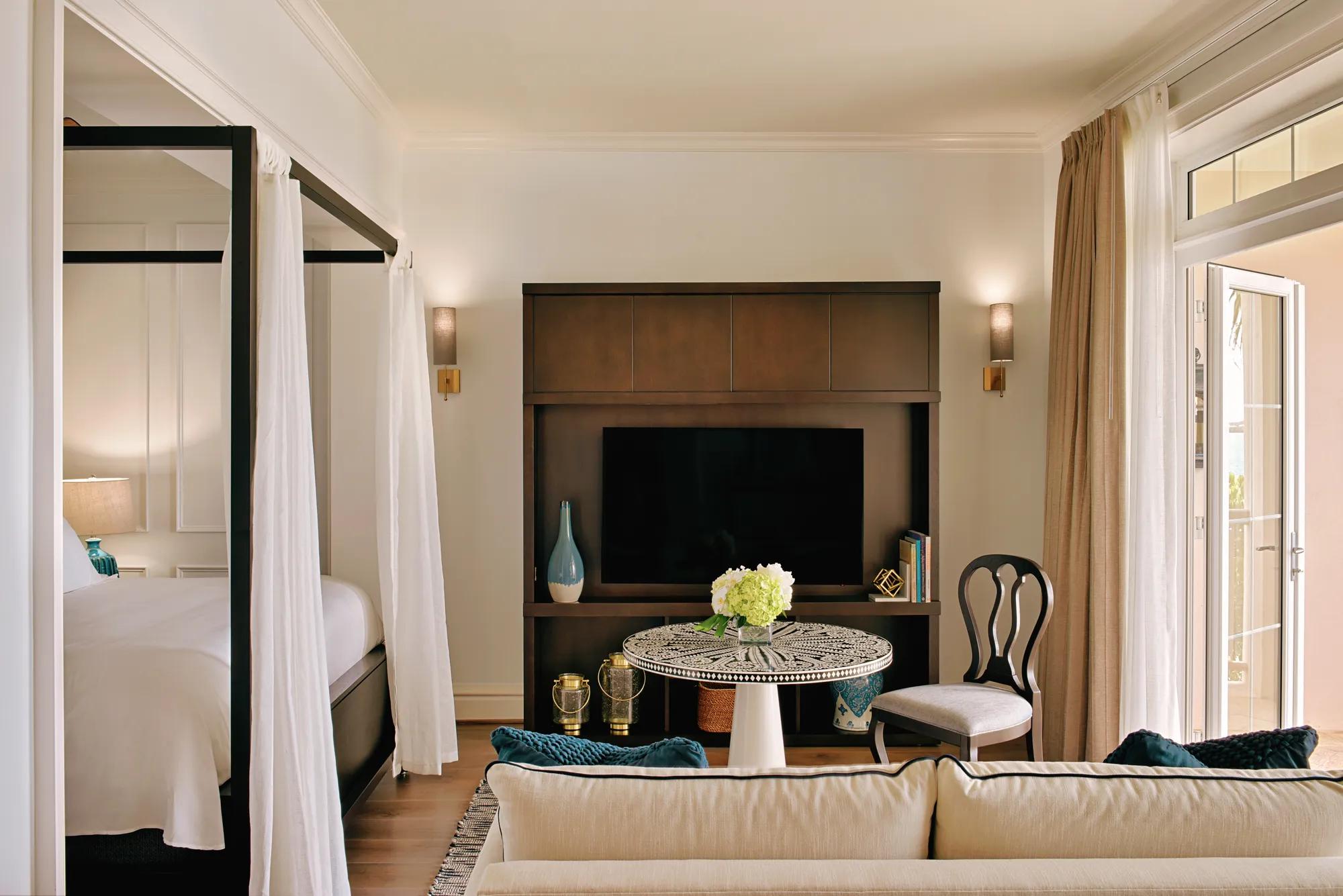 The Harbour View Two-Bedroom suite is comprised of a lavish parlour, living room, wet bar, dining table, sitting area with fireplace, and bedrooms with four-poster beds and walk-in wardrove. The living room and bedrooms open onto expansive balconies tastefully designed for al fresco dining and relaxing with a waterfront view of Castle Harbour.