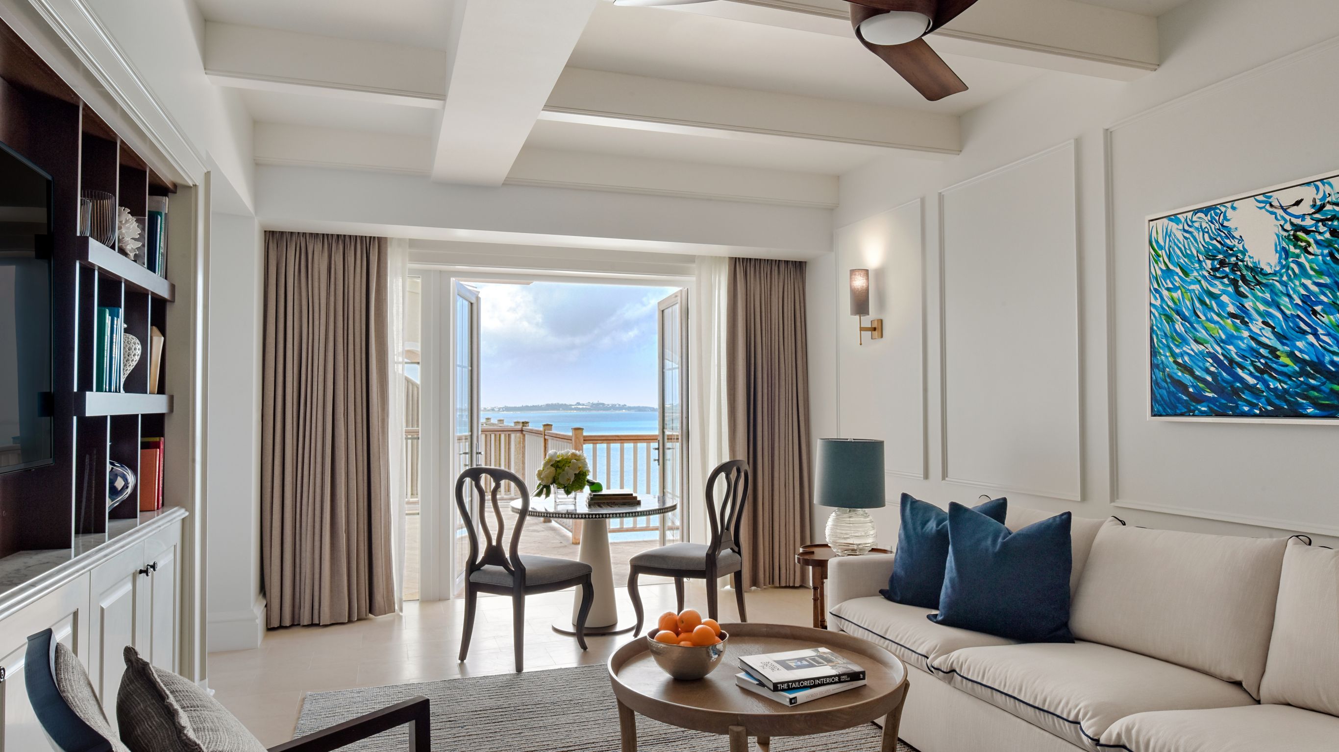 Stone floors, custom rugs and tasteful furnishings adorn the Ocean View One-Bedroom Suites. Each features a parlour and wet bar, a half bath and a bedroom with walk-in closet, en suite bathroom and king-sized bed beneath a crowning canopy. Living and bedroom areas open onto a terrace or balcony with panoramic views of Castle Harbour.