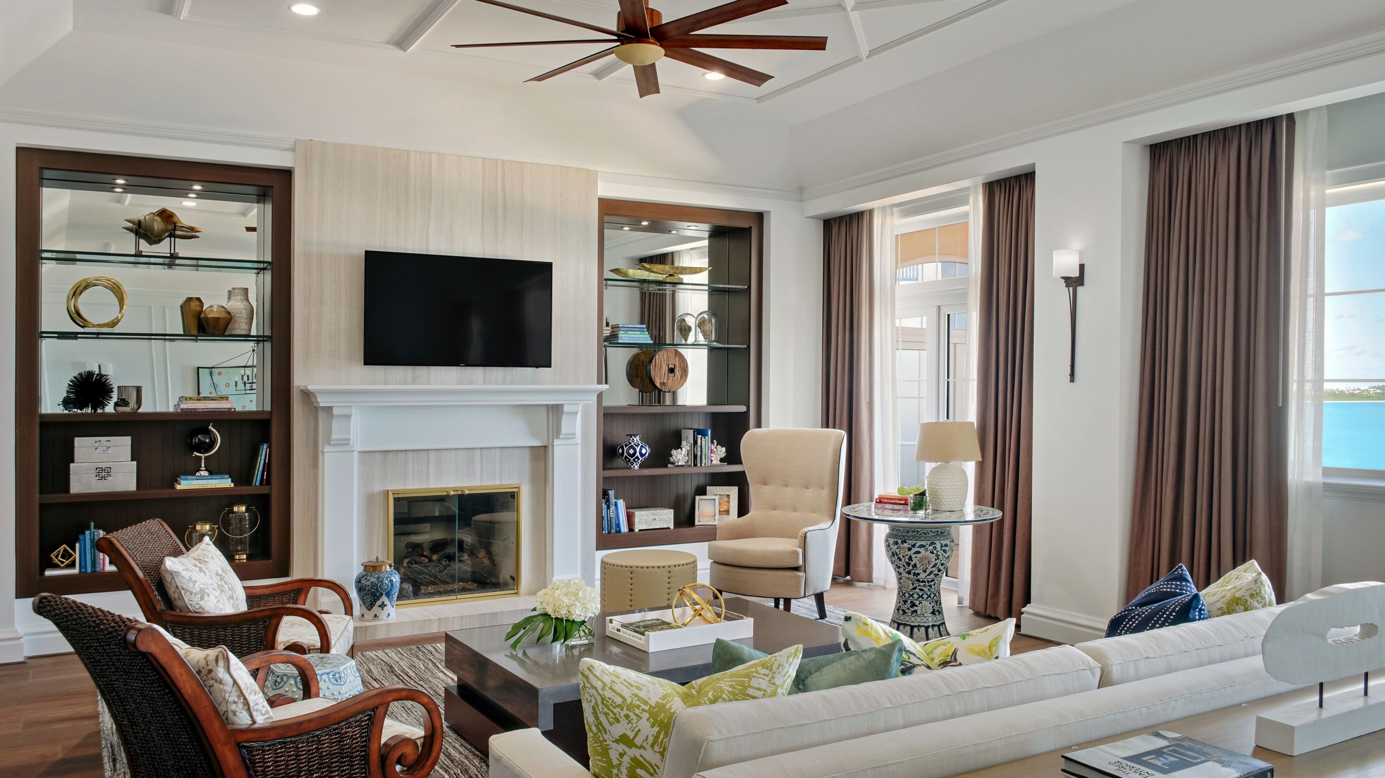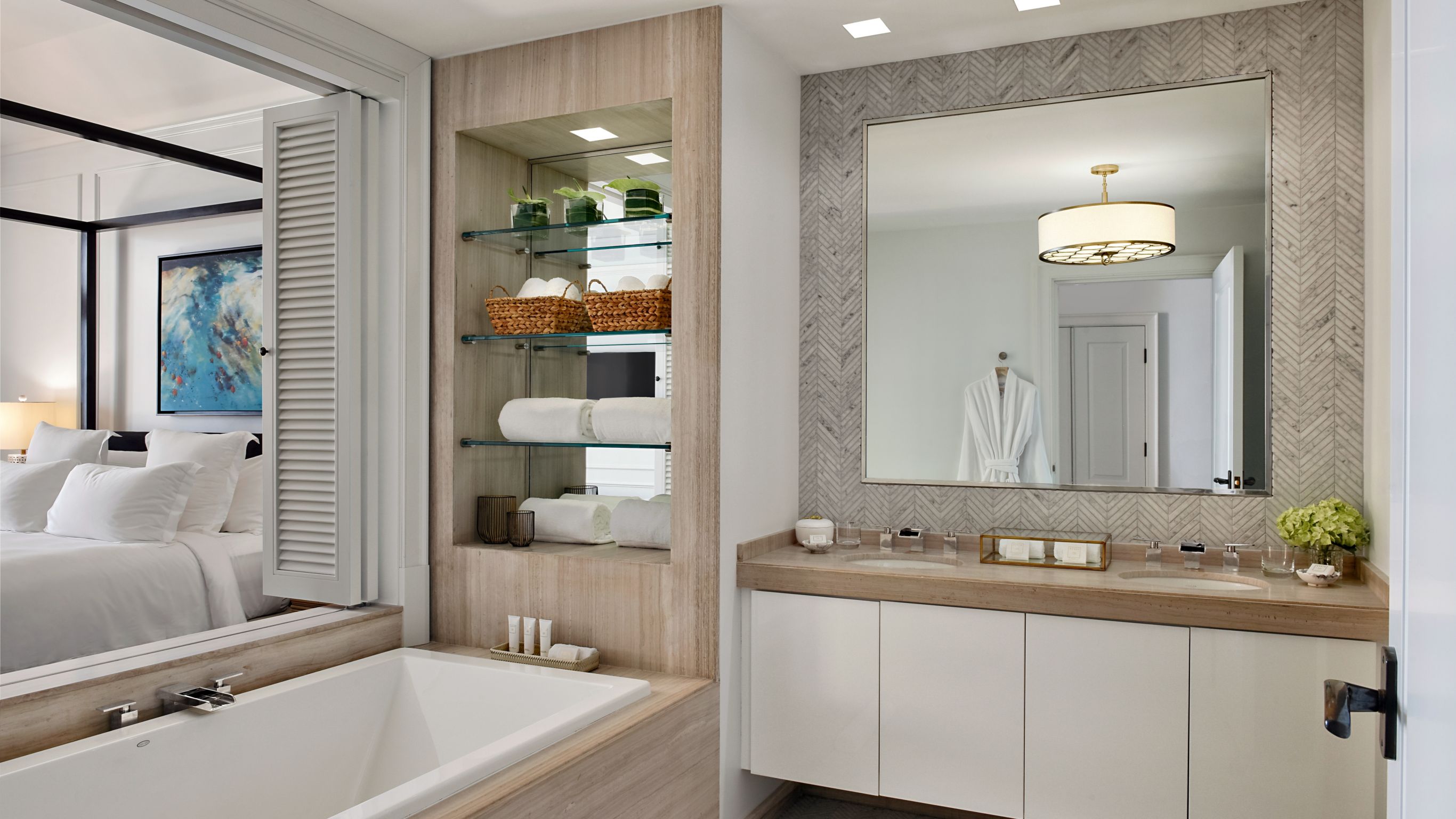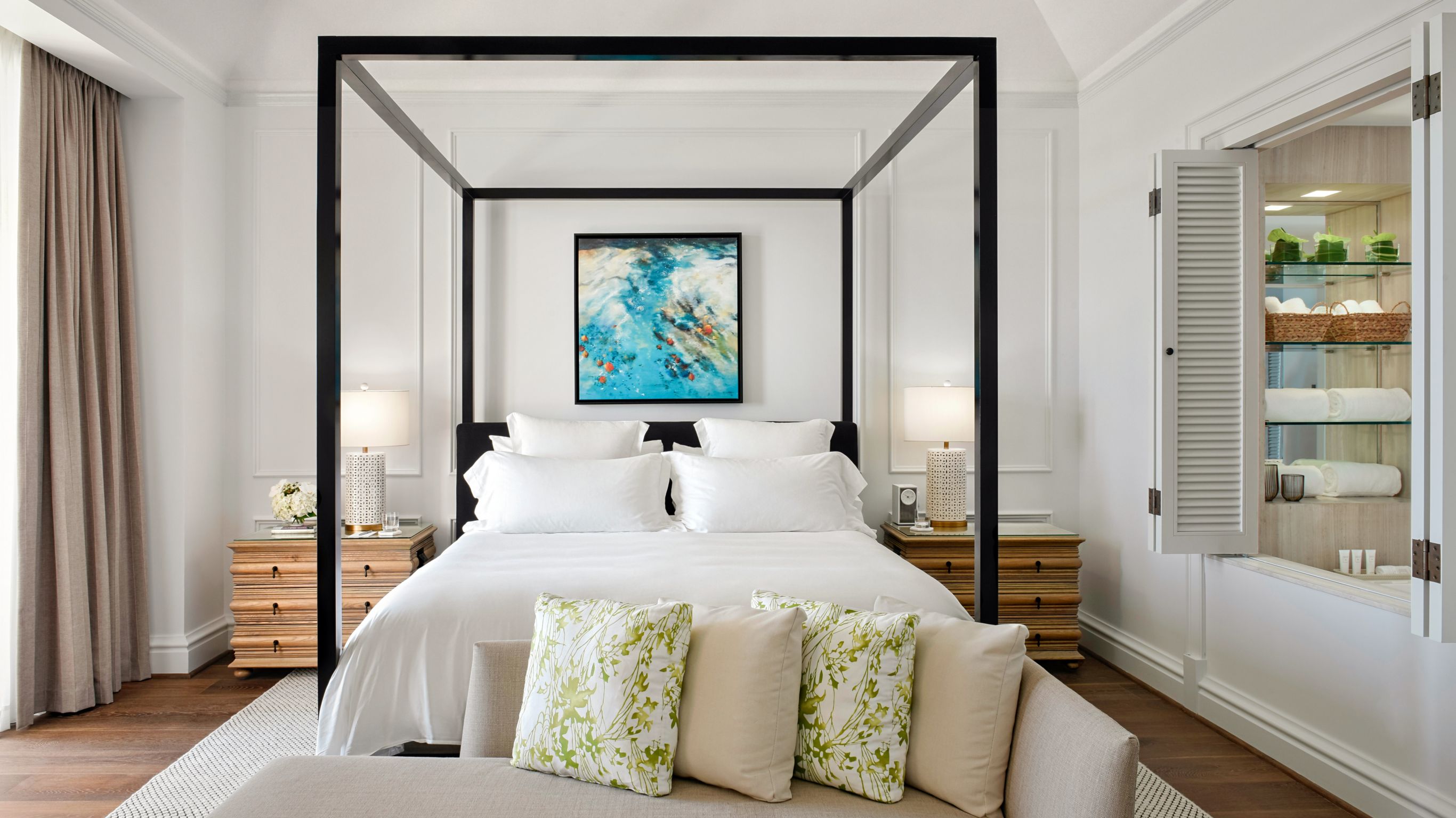 The Royal Two-Bedroom King Suite features two bedrooms, a master bedroom with a King bed, and a second bedroom with two queen beds, as well as en suite baths. The 2,250-square-foot space also includes a spacious living area with service entrance and pantry, study, fireplace, dining area, wet bar and half bath. Outside, a large balcony overlooks Castle Harbour and the beautifully landscaped pool.