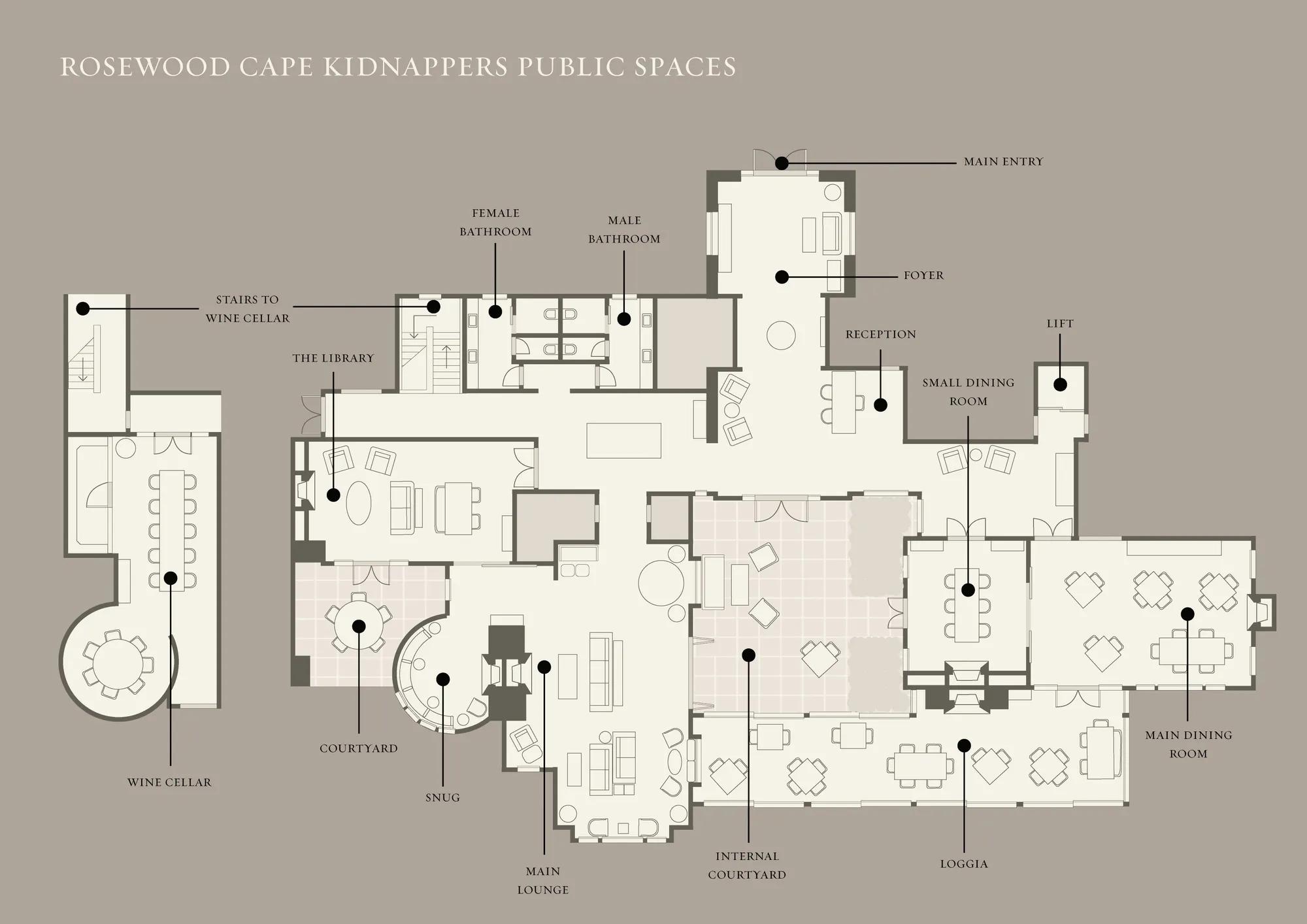 The Loggia stands out as a unique space, featuring abundant windows and seating for up to 42, offering panoramic views and a seamless transition to the meticulously landscaped lawn. Guests can relish the natural surroundings through floor-to-ceiling windows, complemented by the inviting warmth of an open hearth, creating an unforgettable setting for any occasion.