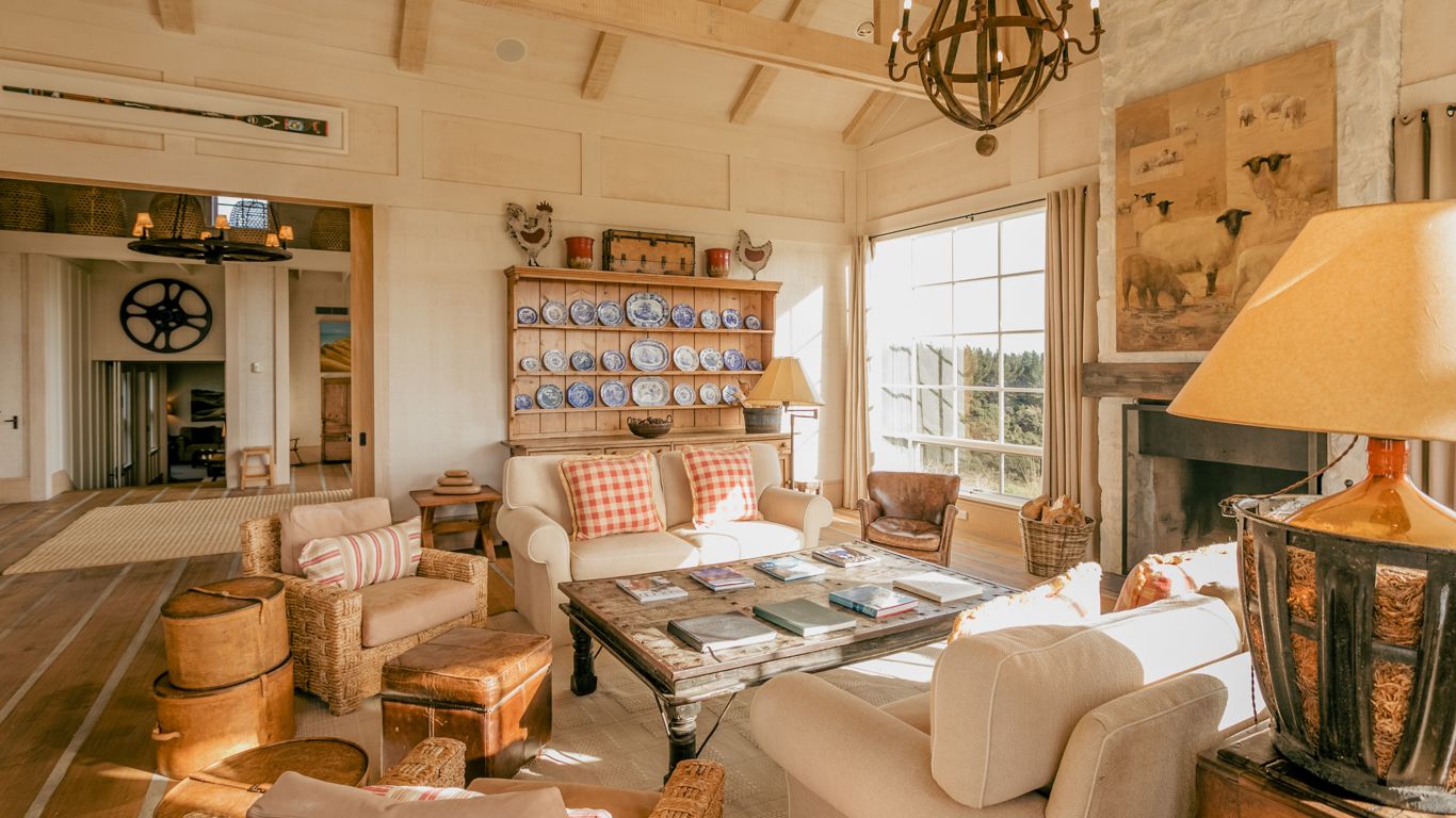 The main living room is a favourite gathering space adorned with luxurious, deep sofas, including a notable piece once owned by actors Demi Moore and Bruce Willis. It's a tasteful blend of antique workbench tables, acclaimed New Zealand artwork, and utilitarian farm tools, all set against natural colour schemes and fabrics like linen, suede, and cotton.