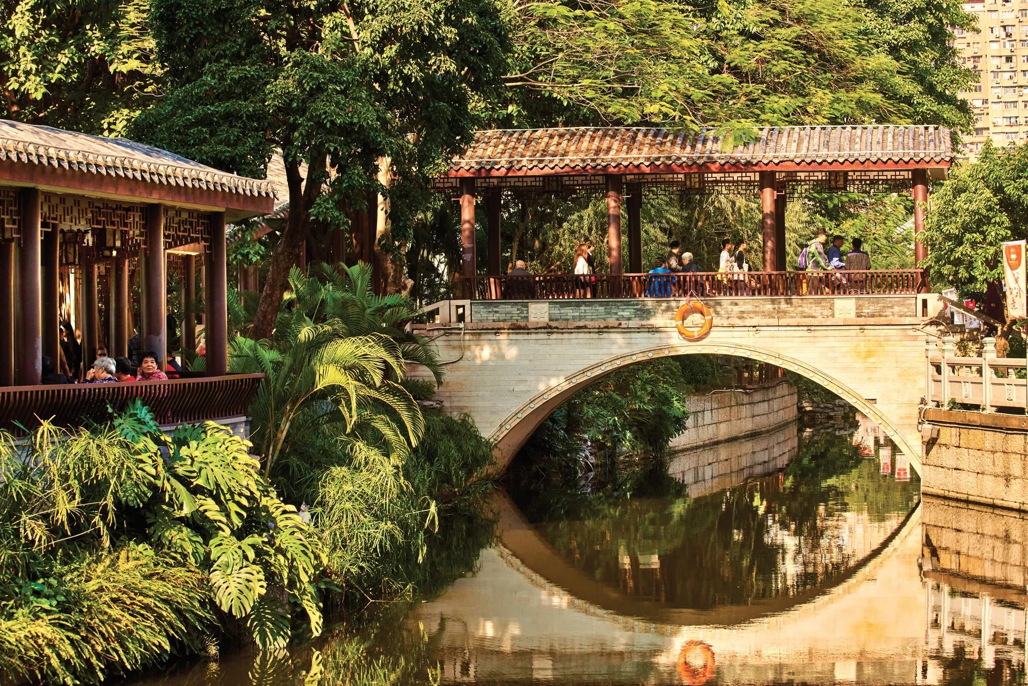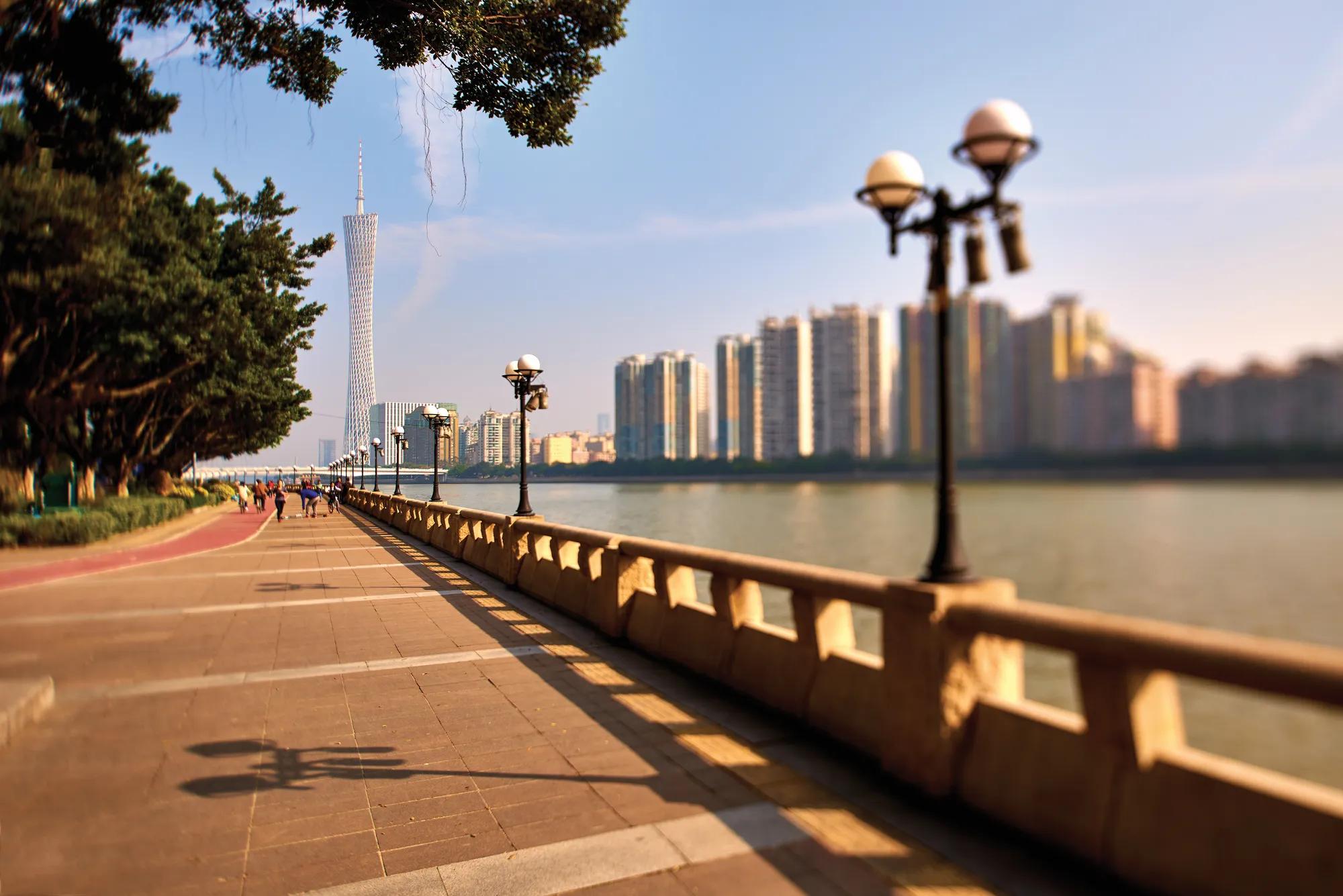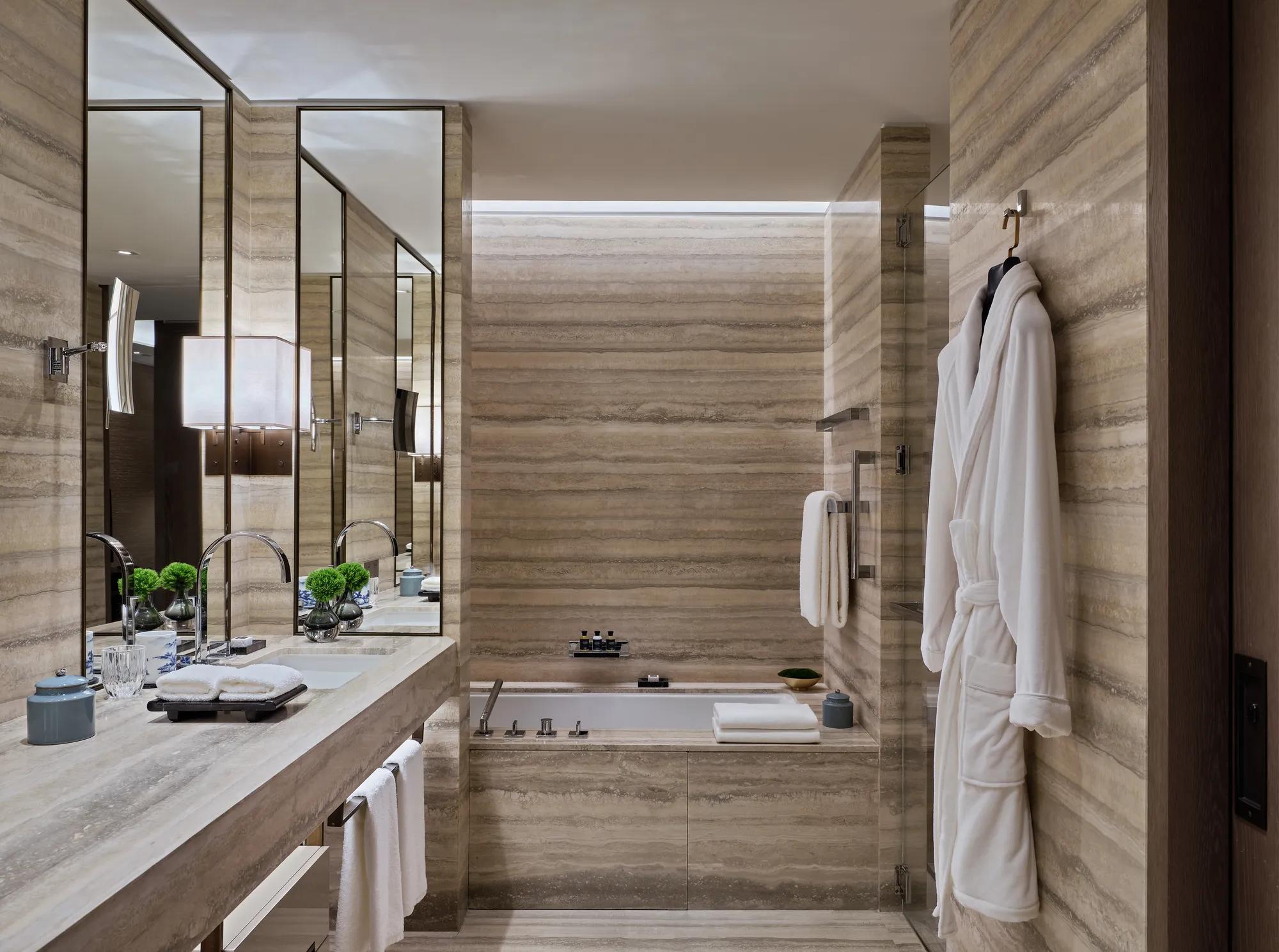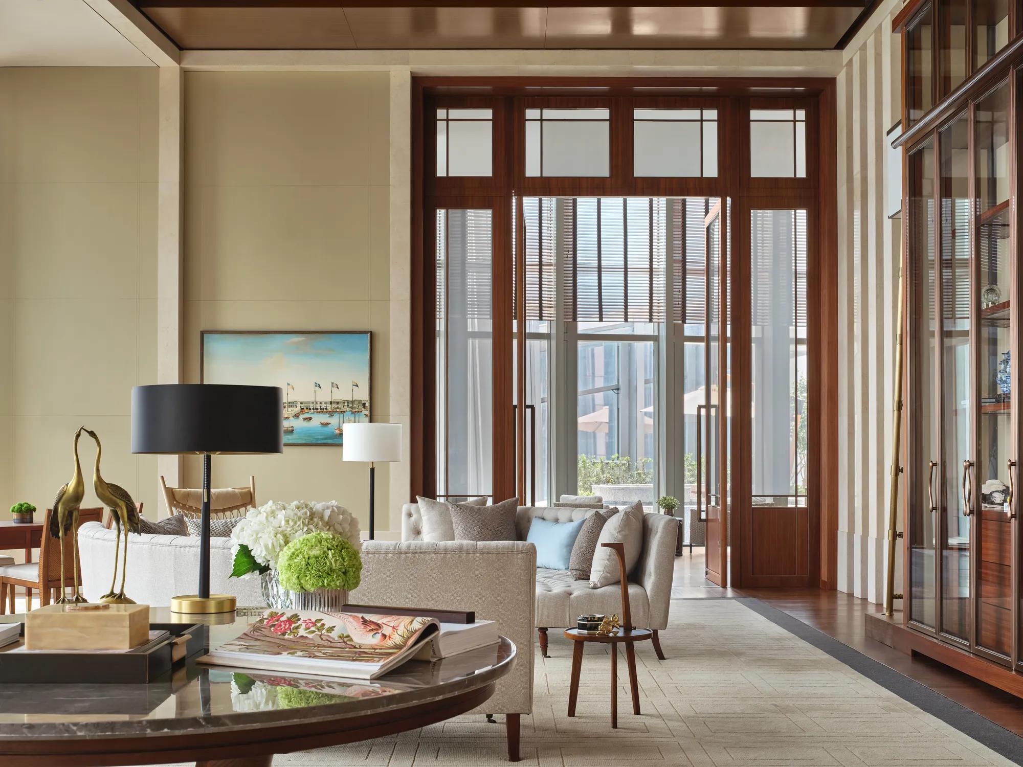 Luminous Pearl River views, wood furnishings, and a marble bathroom create a haven of restful elegance