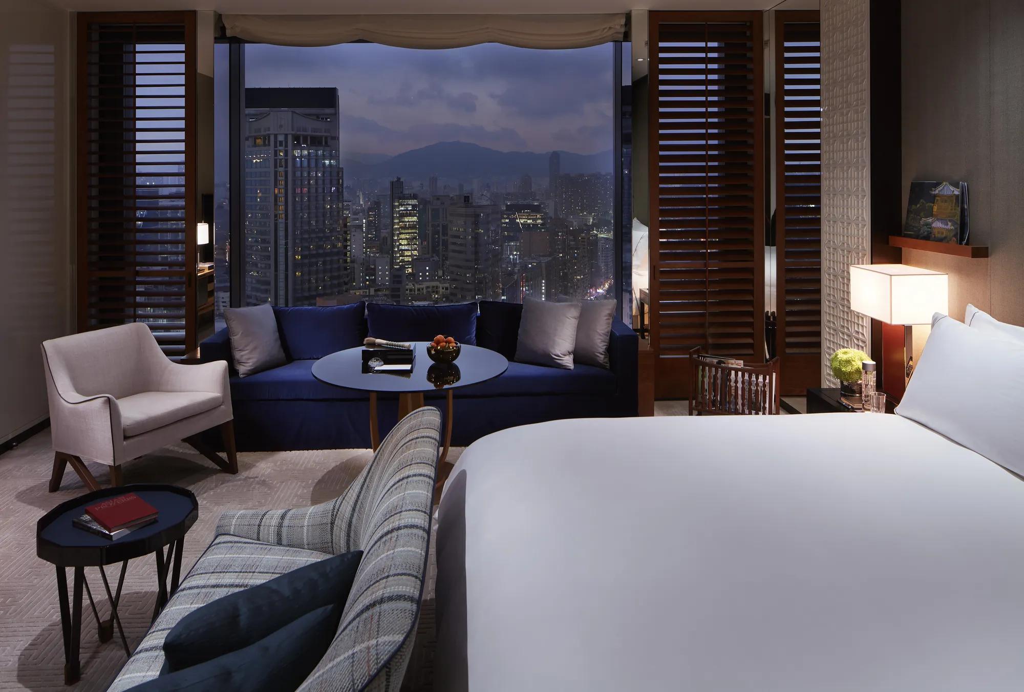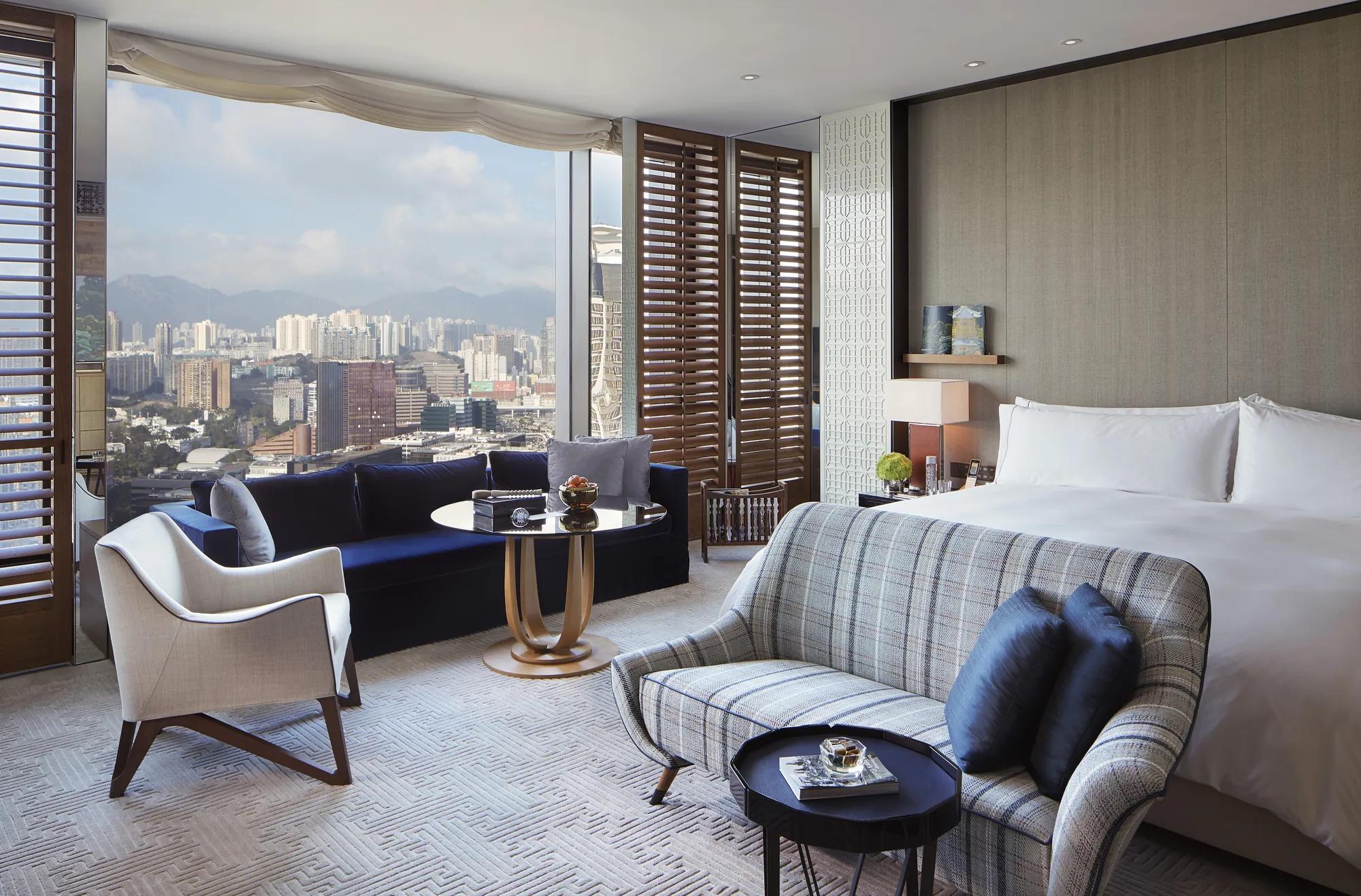 The Kowloon Peak View Rooms face North, with views of the glimmering Kowloon cityscape, the Lion's Rock and Sha Tin mountains in the distance. These spacious, ultra-residential rooms feature 53-square-metres of curated objects, a marble bathroom with freestanding bath and twin sinks, twin showers, and an ample walk-in closet.