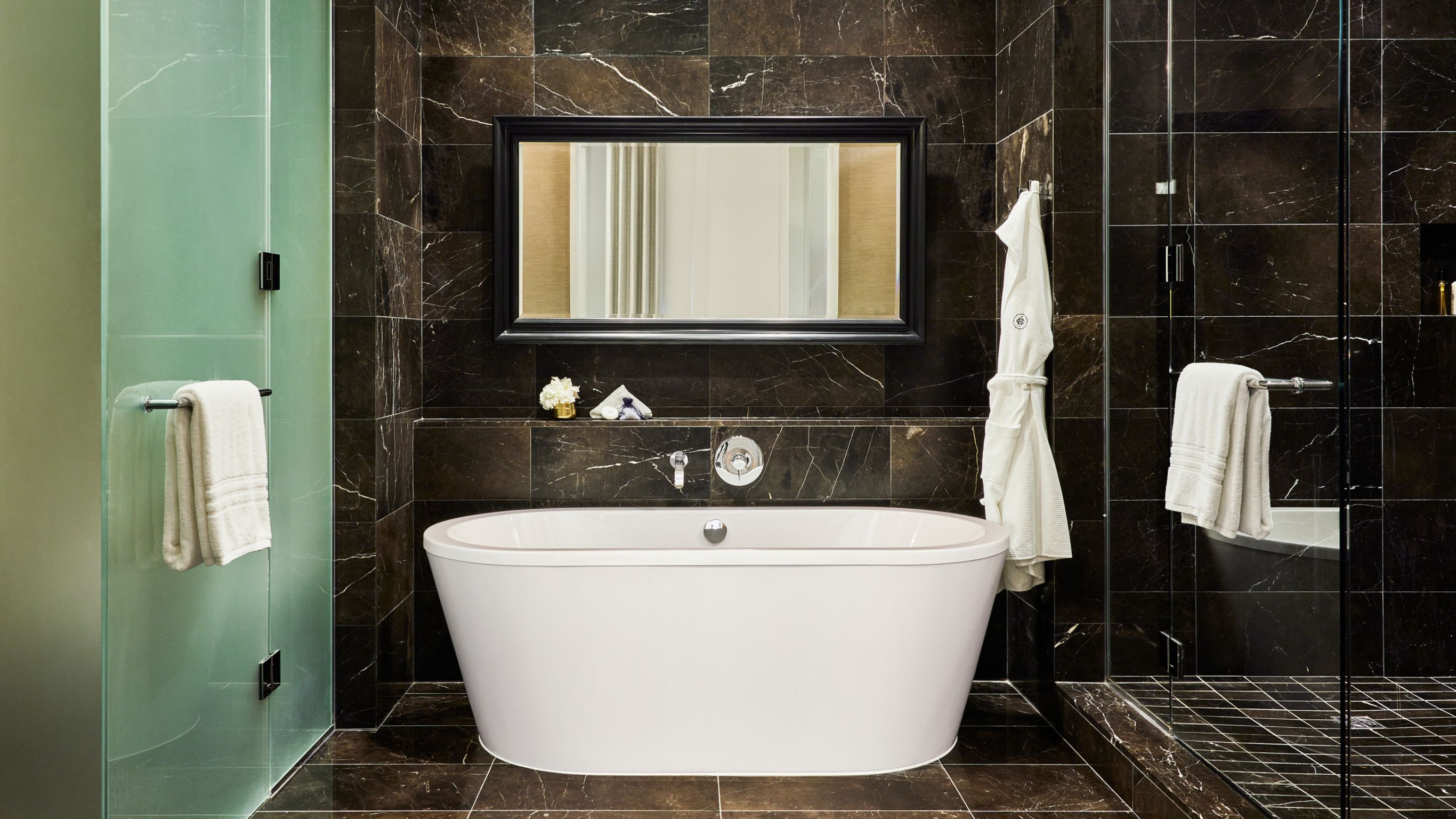 A serene sanctuary where plush velvet meets a spa-inspired bath and a courtyard view invites peaceful moments.