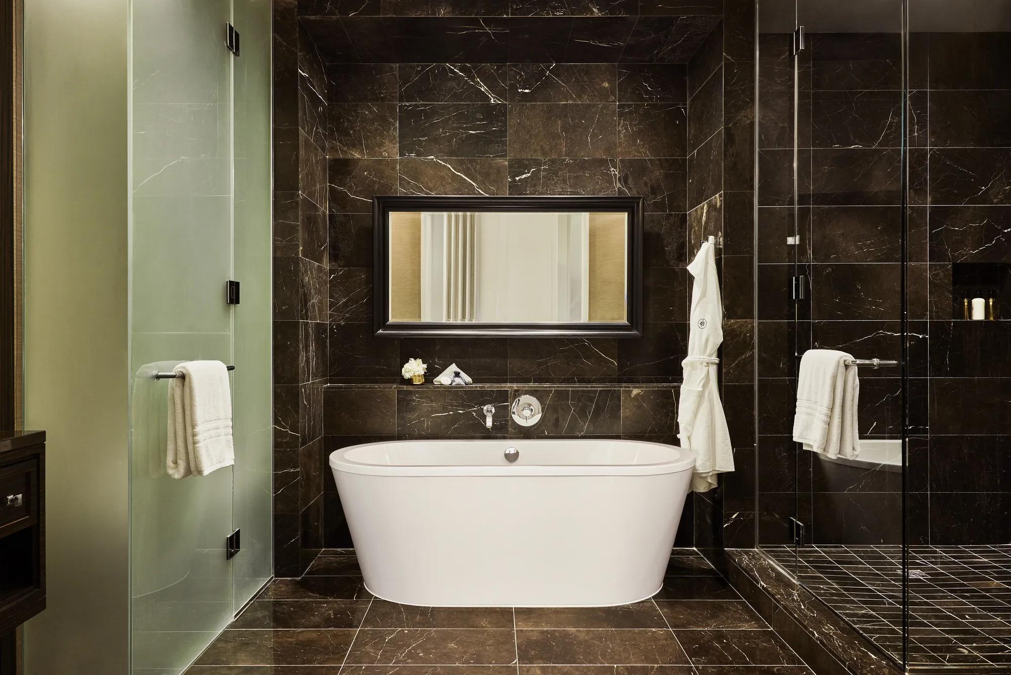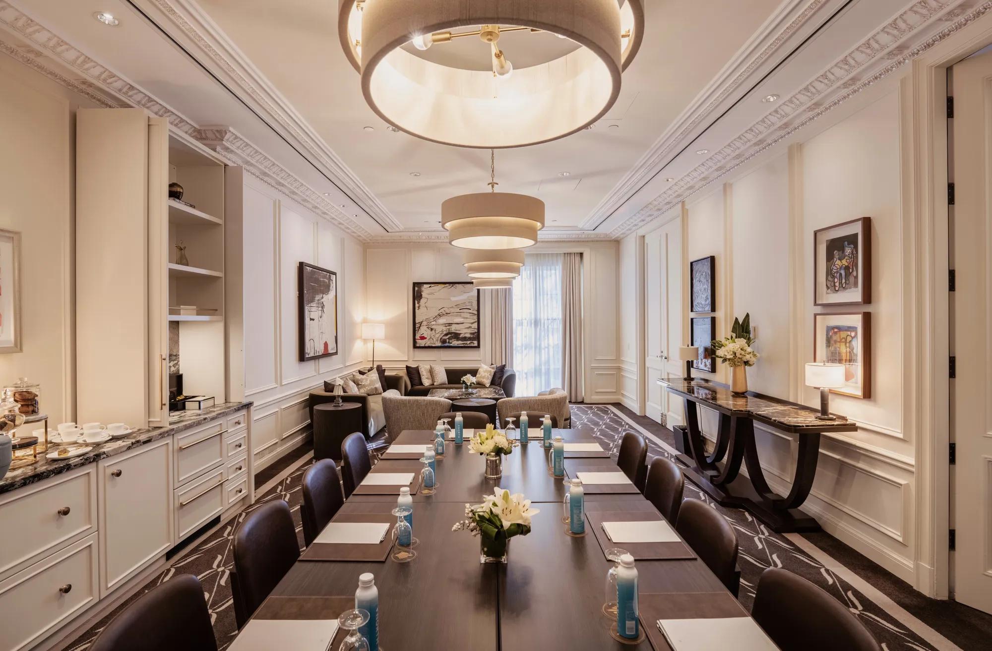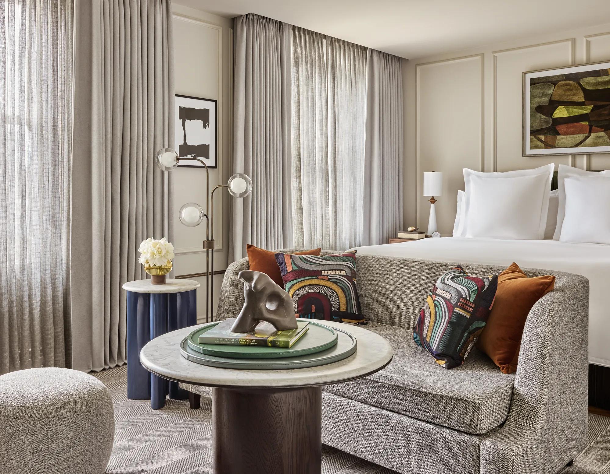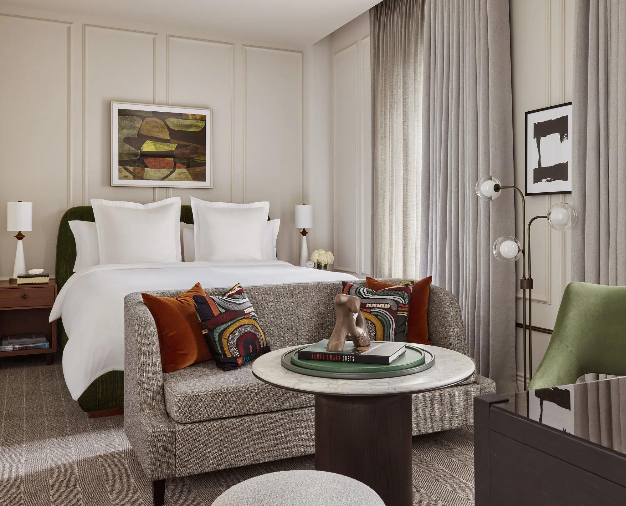 Ranging from 835 - 875 square feet (77 - 81 square meters) the newly renovated Grand Premier Gallery View Suites coccupy the upper floors of the hotel, affording spectacular views of the historic Vancouver Art Gallery and the city skyline beyond. Equipped for entertaining, the art-filled lounge extends to a cocktail bar and dining area. Crisp sheets are tucked tightly across the king size bed, with an intimate seating area and spacious writing desk to aid creative thinking. Settle into your stay with a ample walk-in wardrobe and spa-inspired bathroom; with dual vanities, heated marble floors, walk-in rain shower and a large soaking bathtub. An additional powder room adjoins to the living room. This suite can connect with a Deluxe Room with Two Double Beds for additional space and privacy.