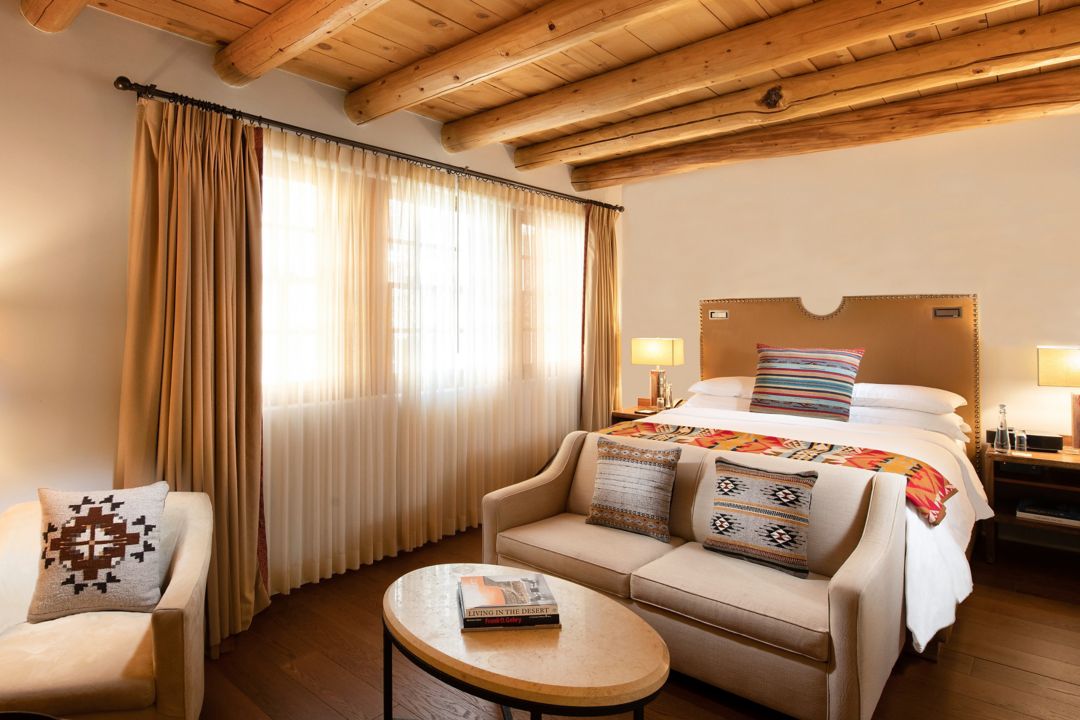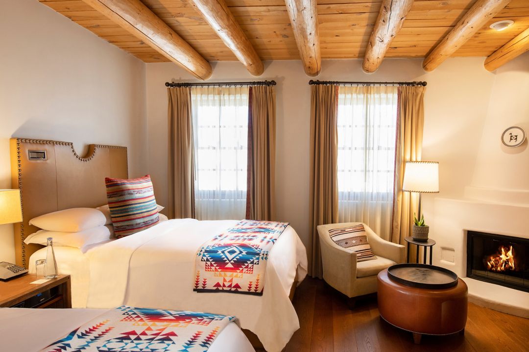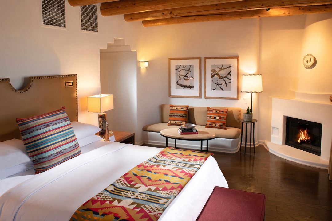 Superior King rooms are available in various layouts, each offering 370 square feet of living space with a king-size bed. Along with authentic local art, handcrafted furnishings and indigenous textiles, each room has a gaslit kiva fireplace and a traditional wooden ceiling of vigas and latillas.