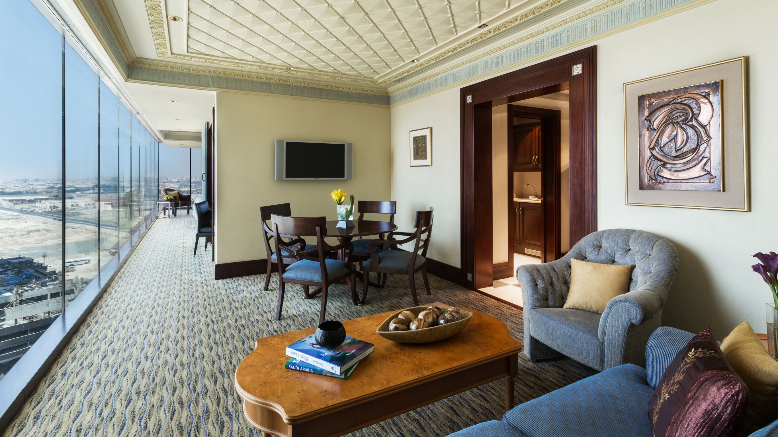 The 65-square-meter (700-sq.-ft.) Executive Suite promises panoramic views of the city and the Red Sea from full-length bay windows. Designed for business or leisure travelers seeking the finest Jeddah hotel suites, for a separate lounge and private dining room with a kitchenette is available for entertaining or meetings.