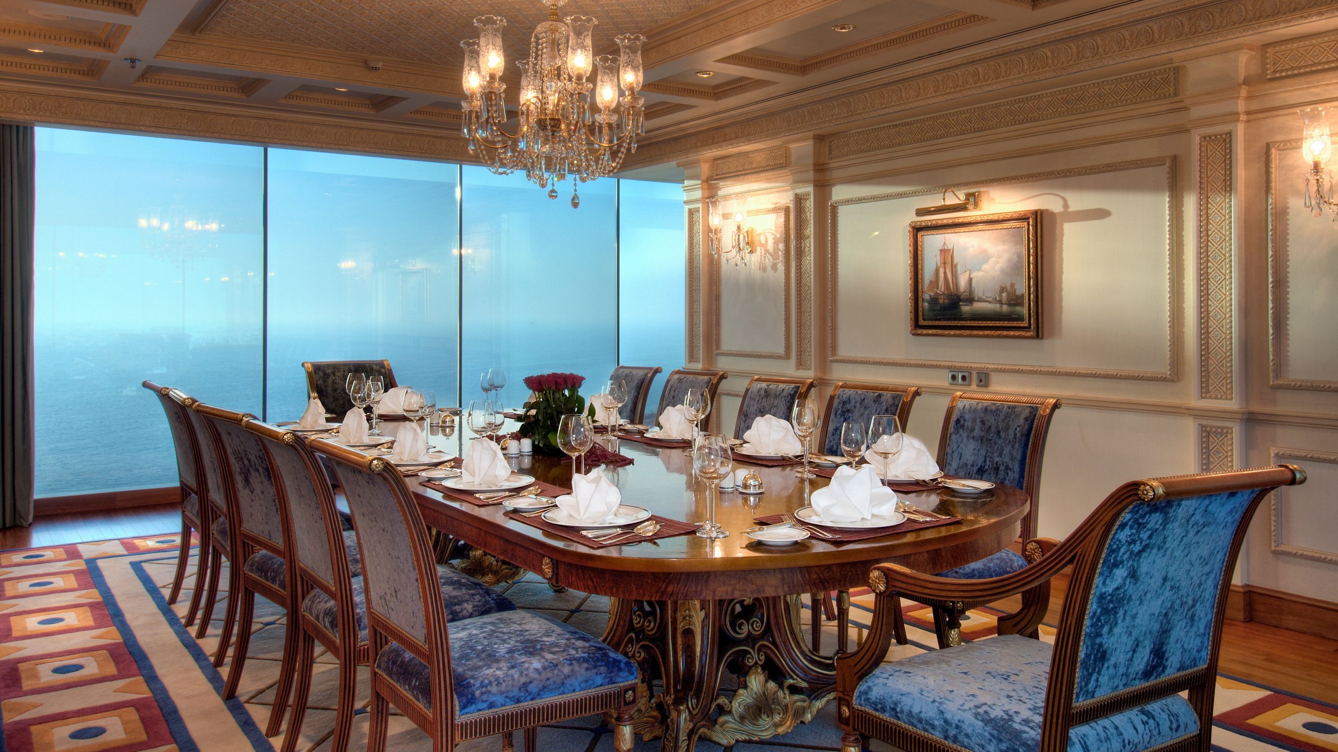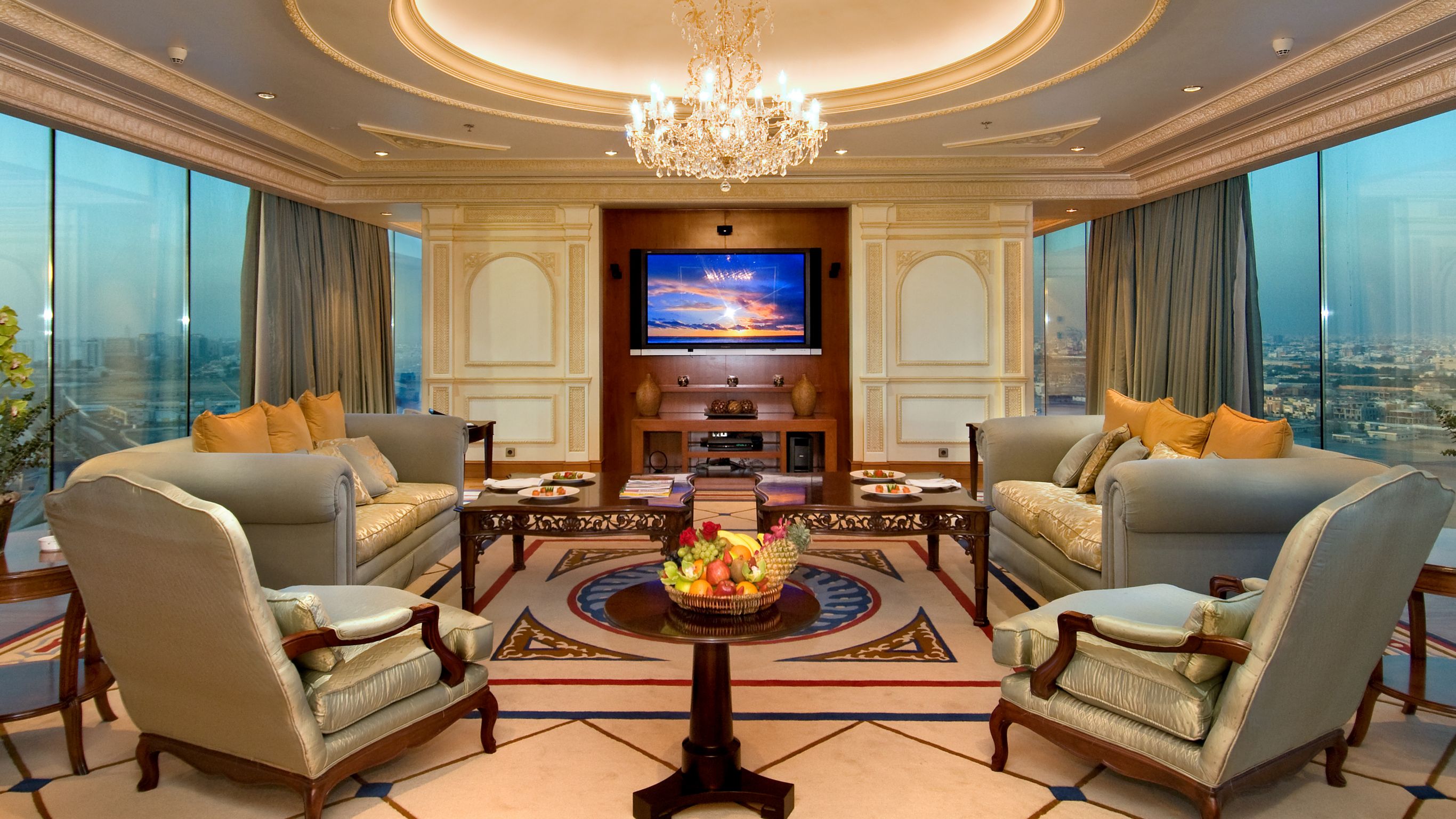 Located on the two highest floors of the hotel, the Royal Suite presents breathtaking vistas over the city and Red Sea. The suite features a home cinema, master bedroom with private dressing area and separate staff accommodations, as well as 24-hour personal butler service, two lounges, private dining room and opulent bathrooms.