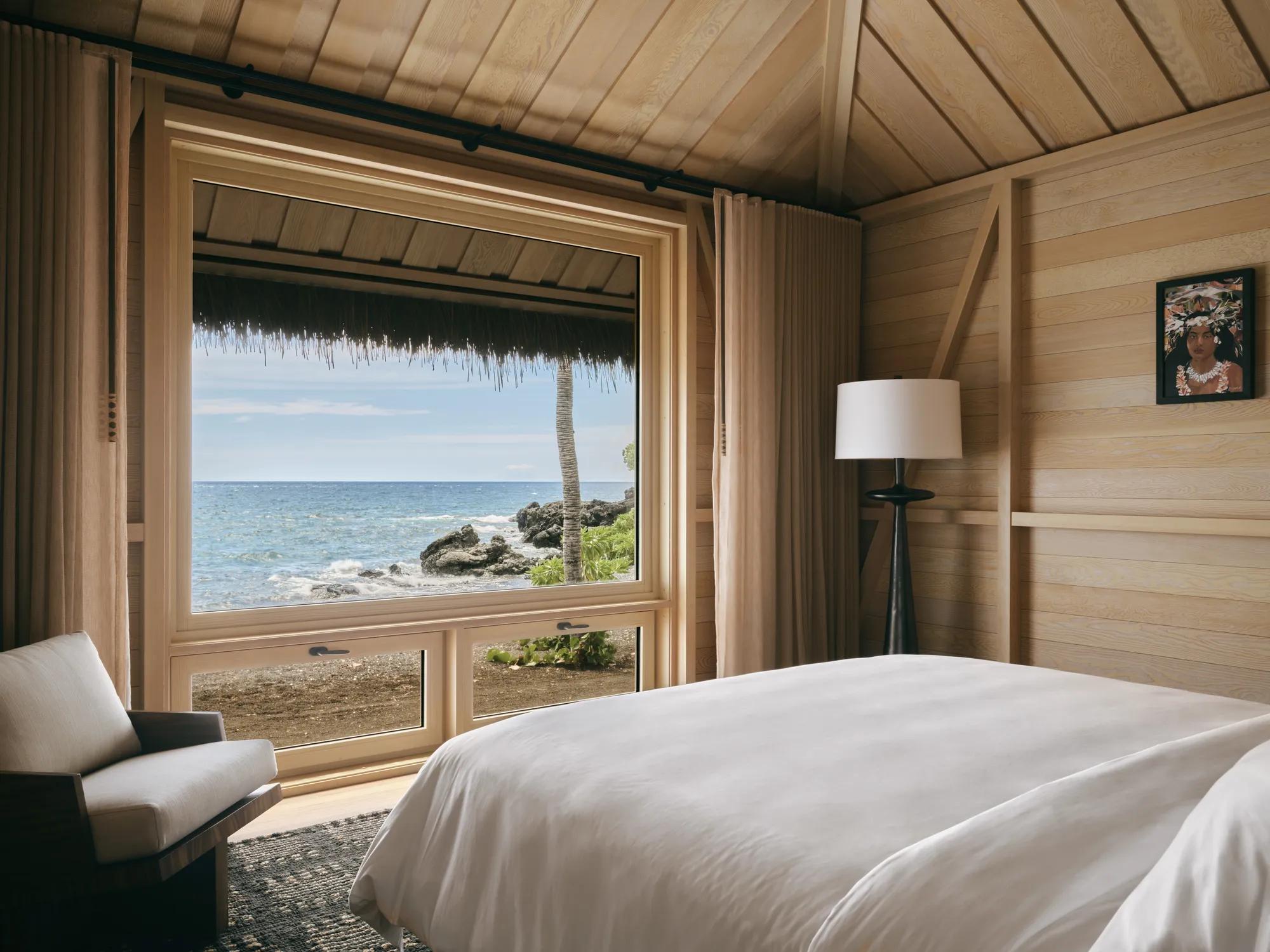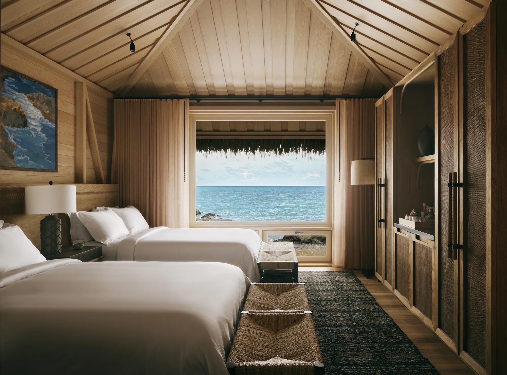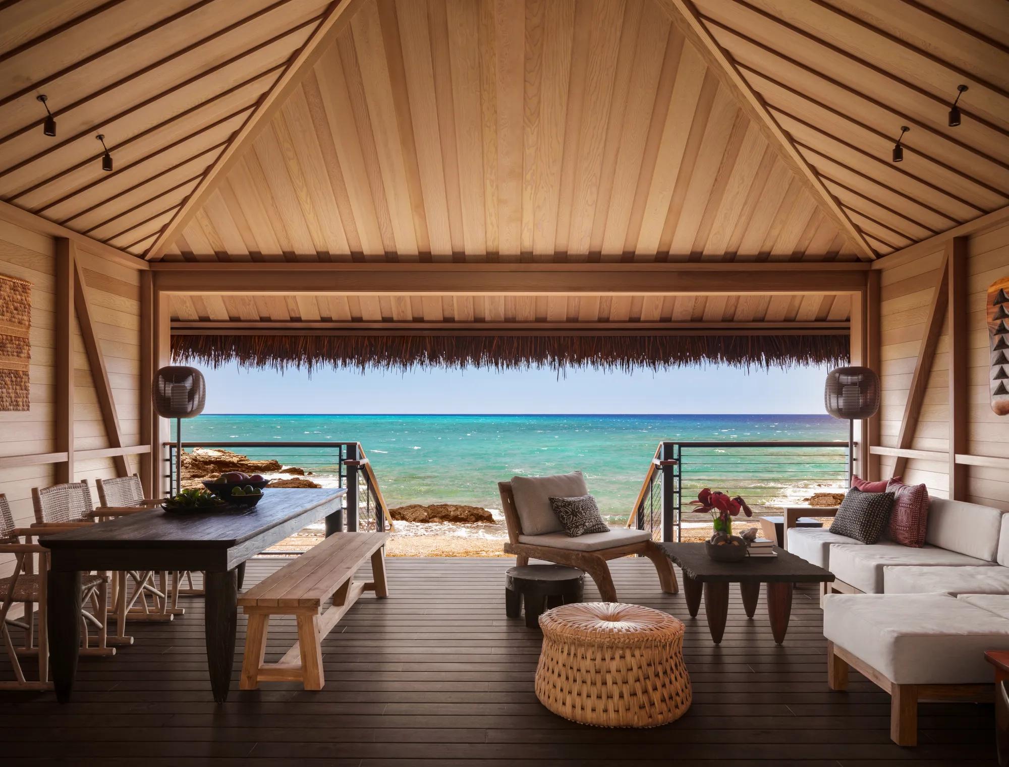 Featuring a unique open-air lounge with a lanai staircase leading directly onto an intimate black sand beach and sweeping views of Kahuwai Bay, the Beach Front Black Sand Two-Bedroom Kauhale includes 1,325 square feet of indoor and outdoor living space. This one-of-a-kind accommodation offers seclusion paired with striking views, bespoke furnishings inspired by the architectural traditions of the island, two full bathrooms, one king and two queen beds, accommodating up to six guests.