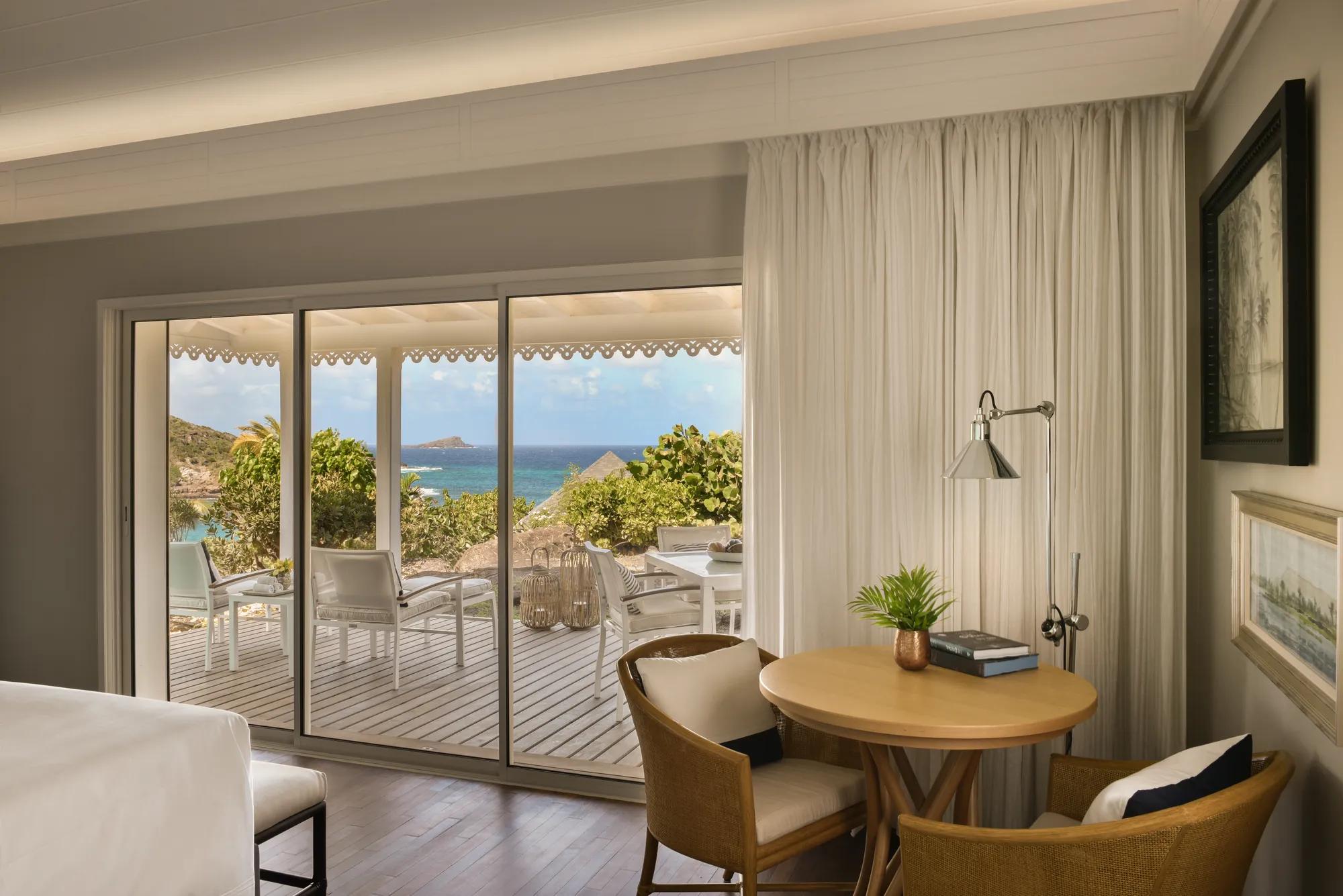Situated in the upper part of the property with views of Marigot Bay, the Ocean Bay Room features a King bed, a bathroom with dual vanities and a rain shower, and a furnished terrace that form an idyllic coastal hideaway.