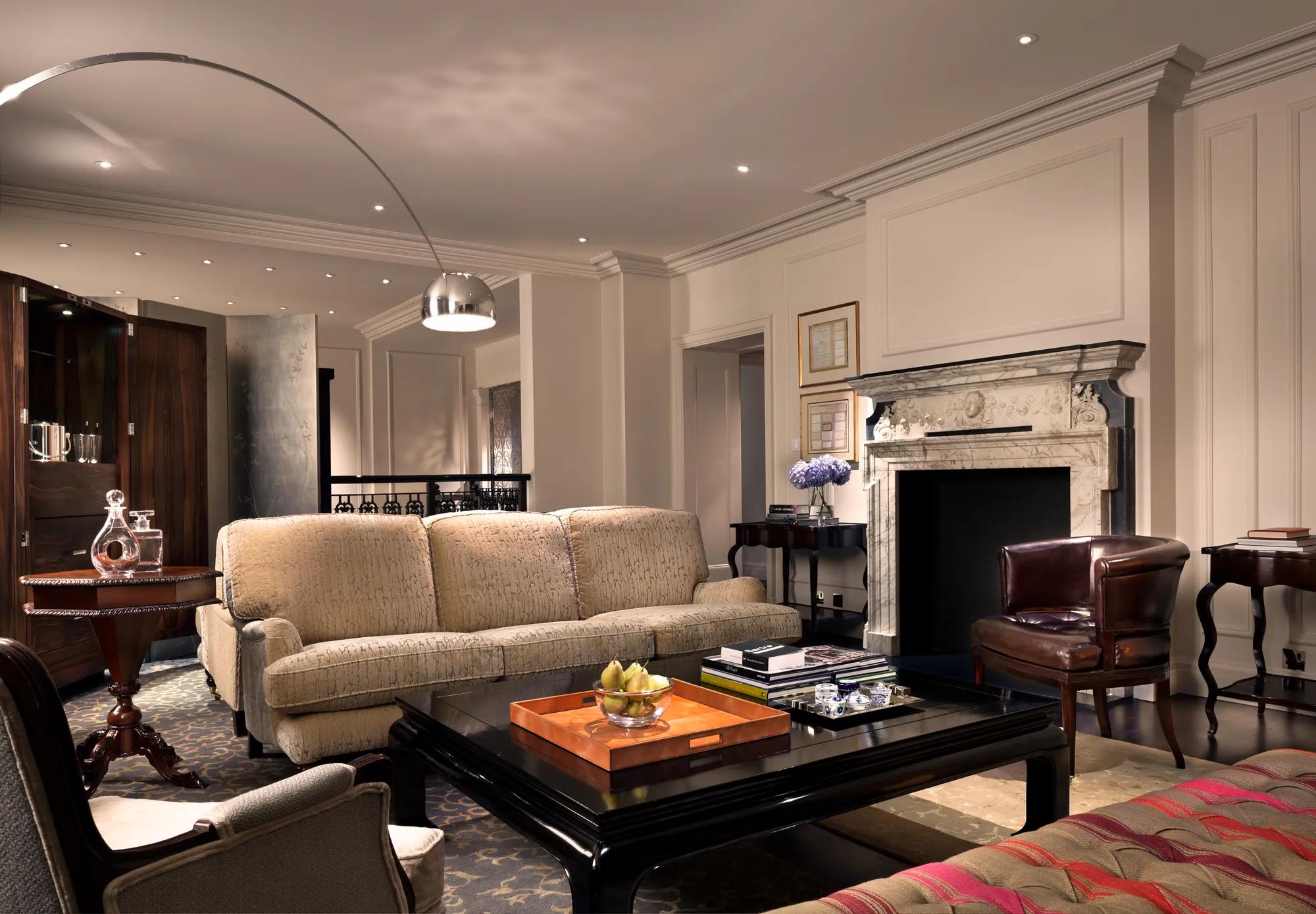 The magnificent 113-square-metre Garden House offers the rare indulgence of a private garden terrace in Central London, with outdoor seating and a dining table for six. Eclectic artwork adorns interior dining, den and living areas, and the suite features a thoughtfully appointed bedroom, dressing room and Italian marble bathroom.