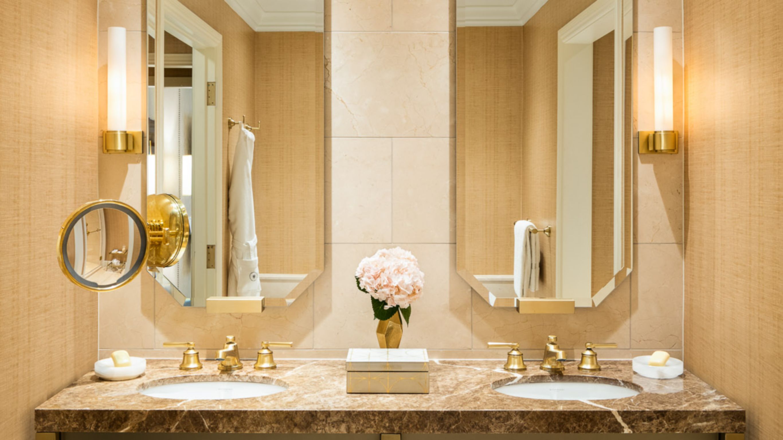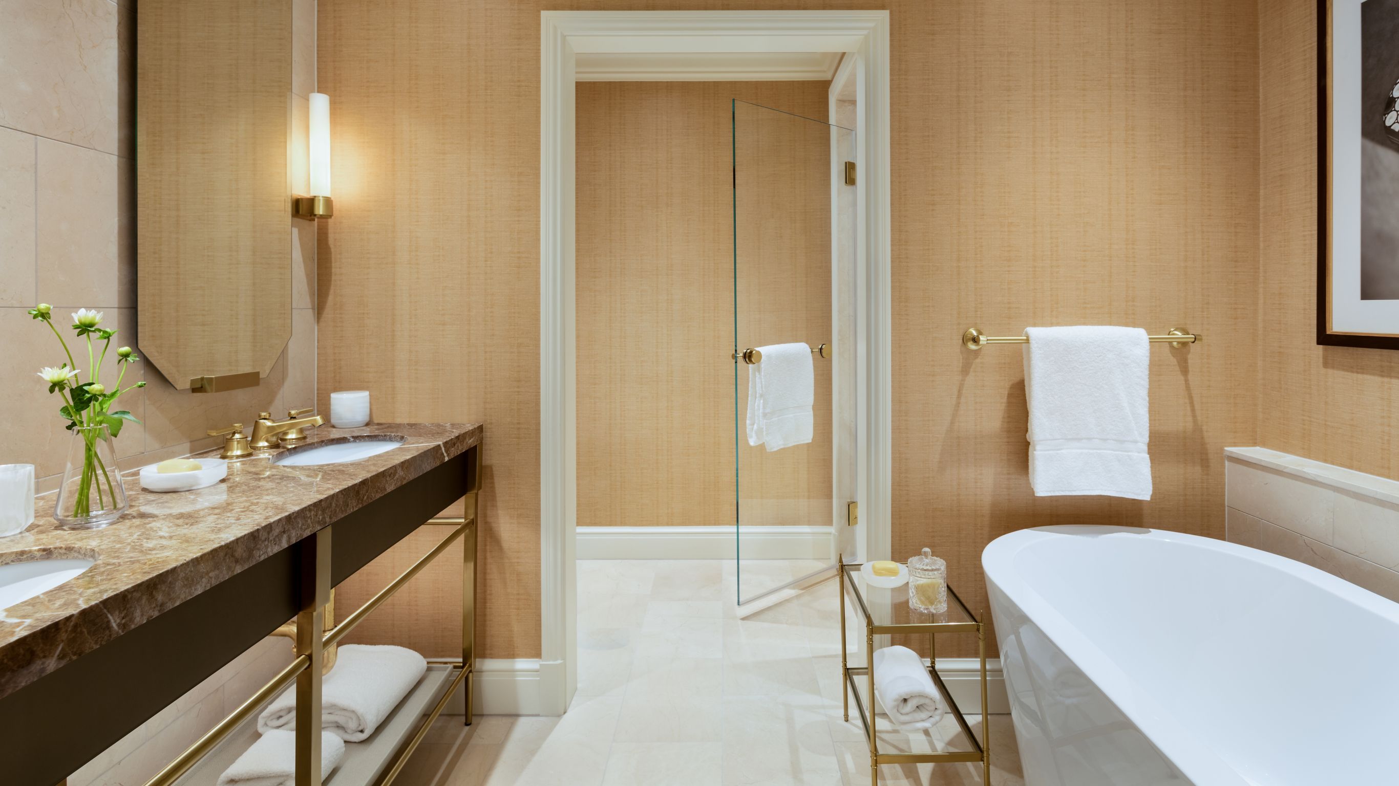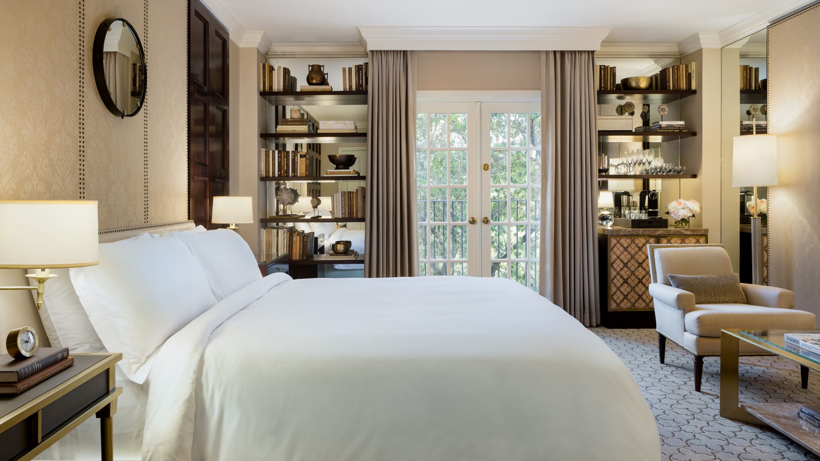 Offering 450 square feet of luxurious living space, the Premier Room features a king bed, sitting area, writing desk, extra closet space and French doors onto a petite balcony with exceptional views of the hotel grounds and neighborhood. The oversized bathroom has a dual vanity, walk-in rain shower, soaking tub and Waterworks fixtures.