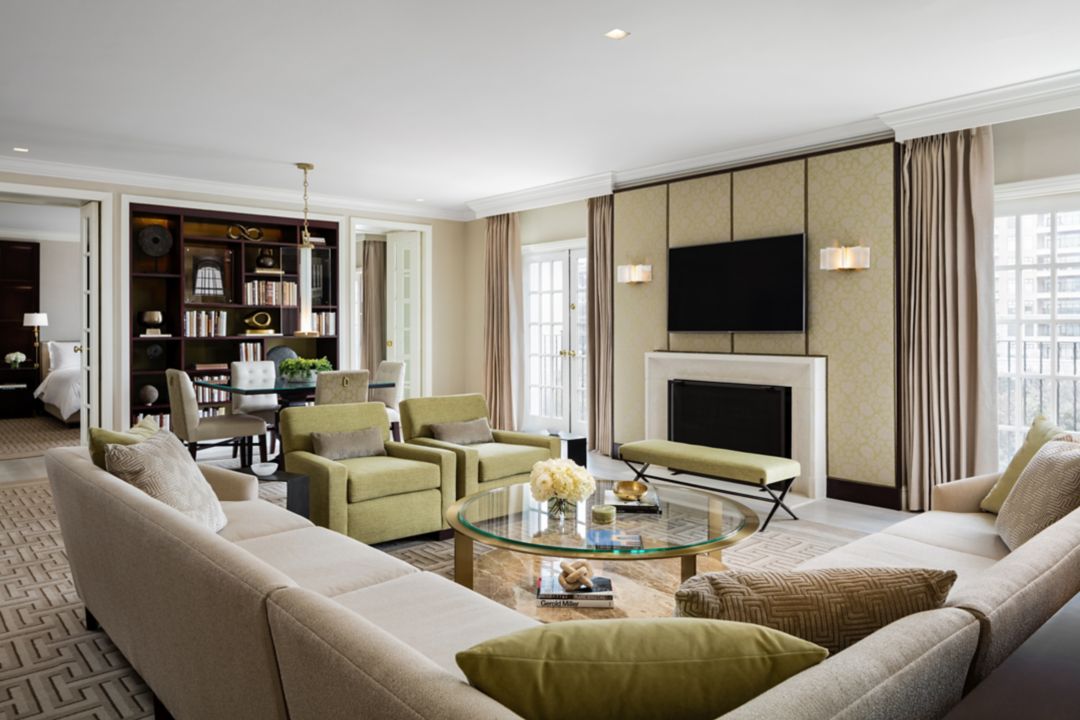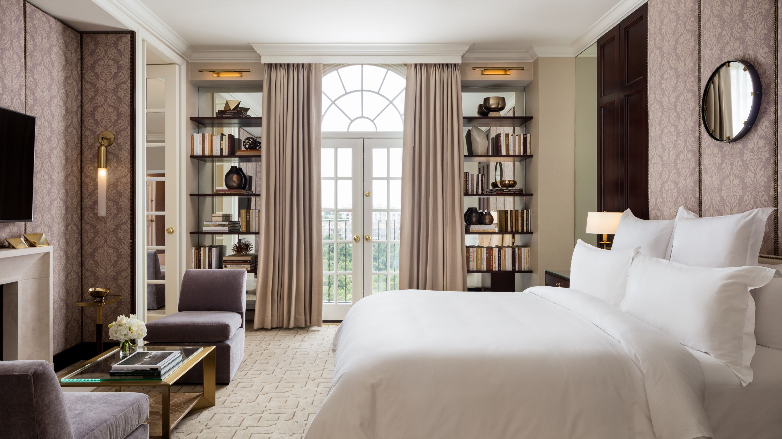 Located on the hotel's top floor, the Mansion Suite features soaring ceilings and arched French doors opening onto petite balconies. Mirrored double doors separate the living room and the king bedroom. A guest powder room is located off the foyer. The suite’s spacious bathroom features a dual vanity, soaking tub and oversized walk-in rain shower. The suite can connect to a Grand Deluxe Double Room or Premier Room.