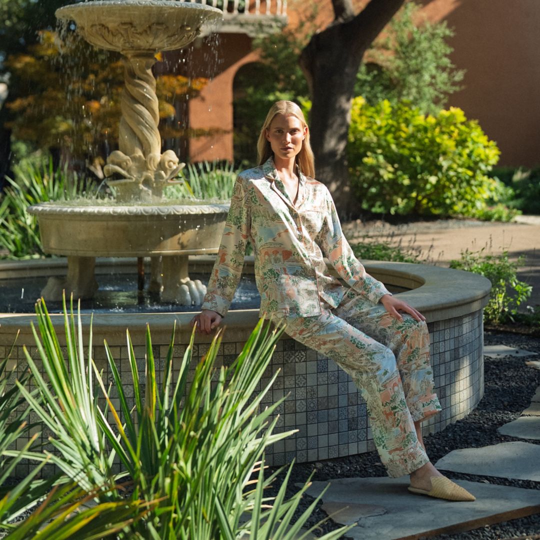 In celebration of 100 years of The Mansion Estate, we are pleased to introduce our new loungewear collection. Hand-drawn at Olivia von Halle’s London studio, The Mansion print captures both the storied soul of the estate and the lively rhythm of Dallas itself. Its playful vignettes celebrate the property’s most beloved details: the iconic cupola, ornate plaster ceilings of The Mansion Library, blooming magnolias in the manicured gardens, and the impeccably chic décor of the celebrated Mansion Bar. Woven throughout are motifs that nod to the heart and heritage of Dallas, rendered in a color palette inspired by The Mansion’s distinctive peach-hued stucco façade that has welcomed guests for generations.