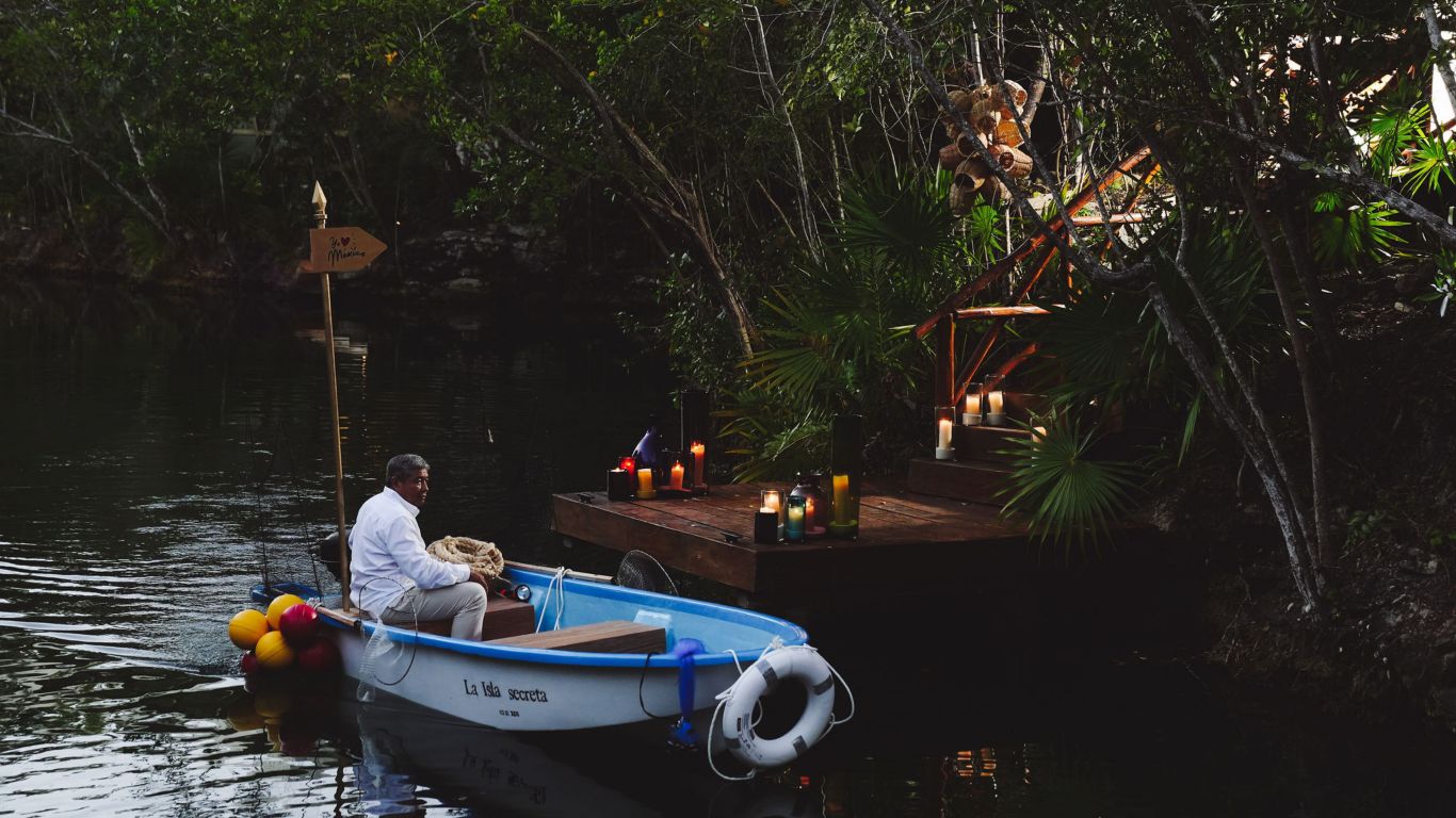 A retreat within a retreat, the exclusive reservation-only experience whisks guests from their suite-side private docks to the warm copal-scented La Isla Secreta. Upon arrival, guests are greeted with a bohemian yet elegant lounge, complete with conversational seating and rich organic textures including plush woven rugs and artisanal Yucatán textiles. Surrounded by dense greenery and hanging plants, flickering lanterns, and serene winding lagoons, the jungle lounge’s soft music complements the scene with slow rhythms designed to embrace the laid-back luxury of the space.