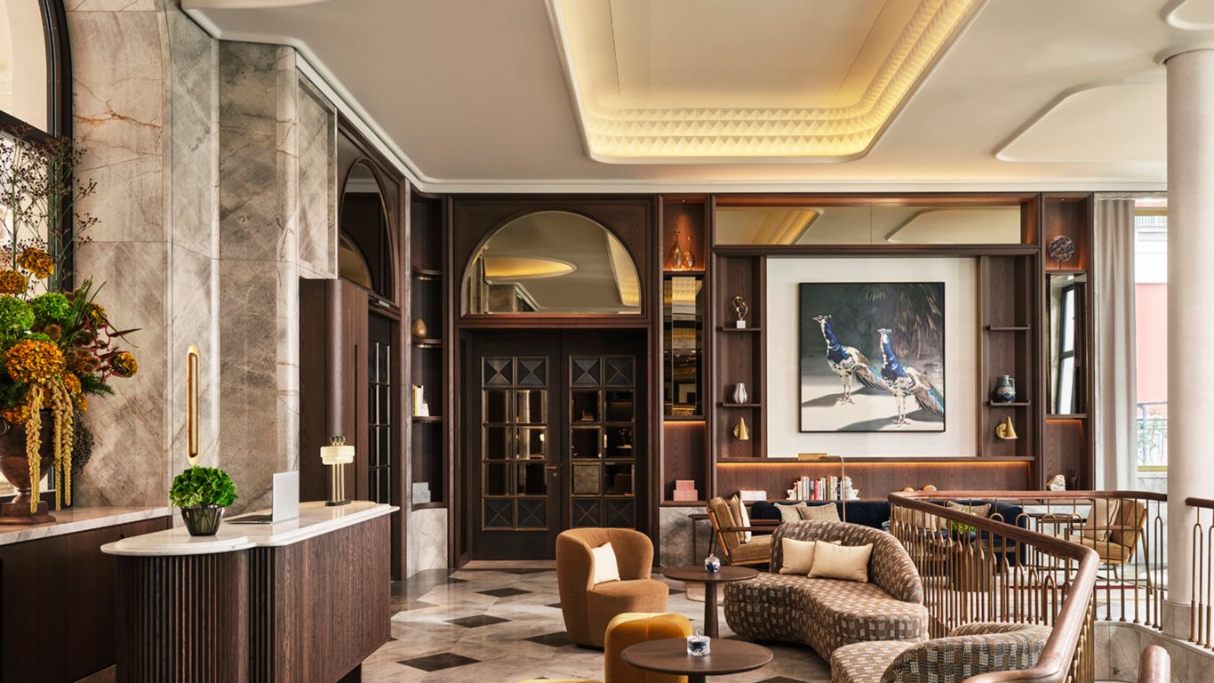 Upon entering the grand hotel lobby, guests are greeted by stylish remnants of the former bank building, such as the graceful staircase, vaulted ceiling, and preserved frescoes, collectively crafting a unique and evocative ambiance in the space.