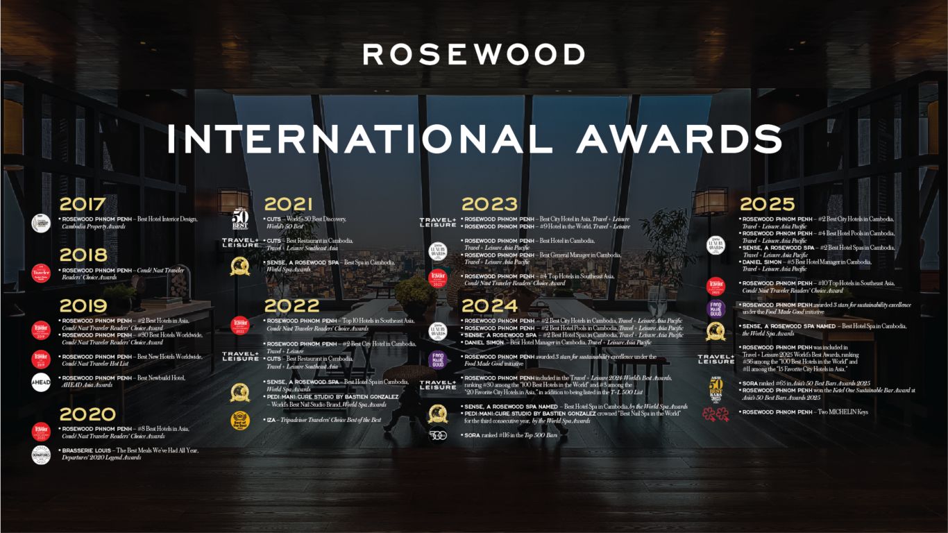 Rosewood Phnom Penh is included in TRAVEL + LEISURE 2025 World’s Best Awards, ranking #56 on the “100 Best Hotels in the World” and #11 in the “15 Favorite City Hotels in Asia”.