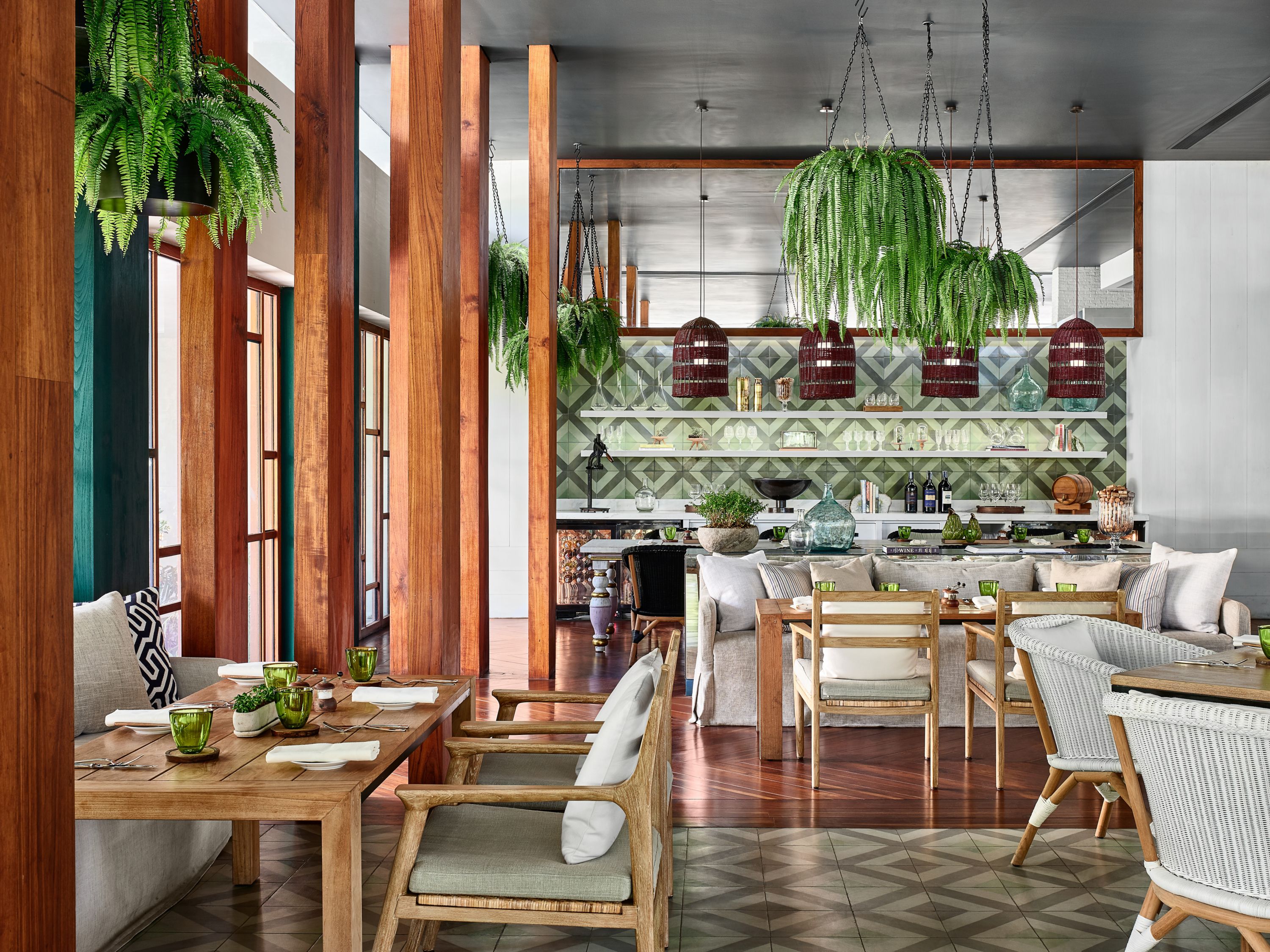 An open-sided terrace overlooks the serene swimming pool and offers stunning Emerald Bay vistas. At the large central open kitchen, guests can gather with friends and family as is customary in Italian households and interact with the chefs and their team while enjoying an early evening aperitif or culinary creation.