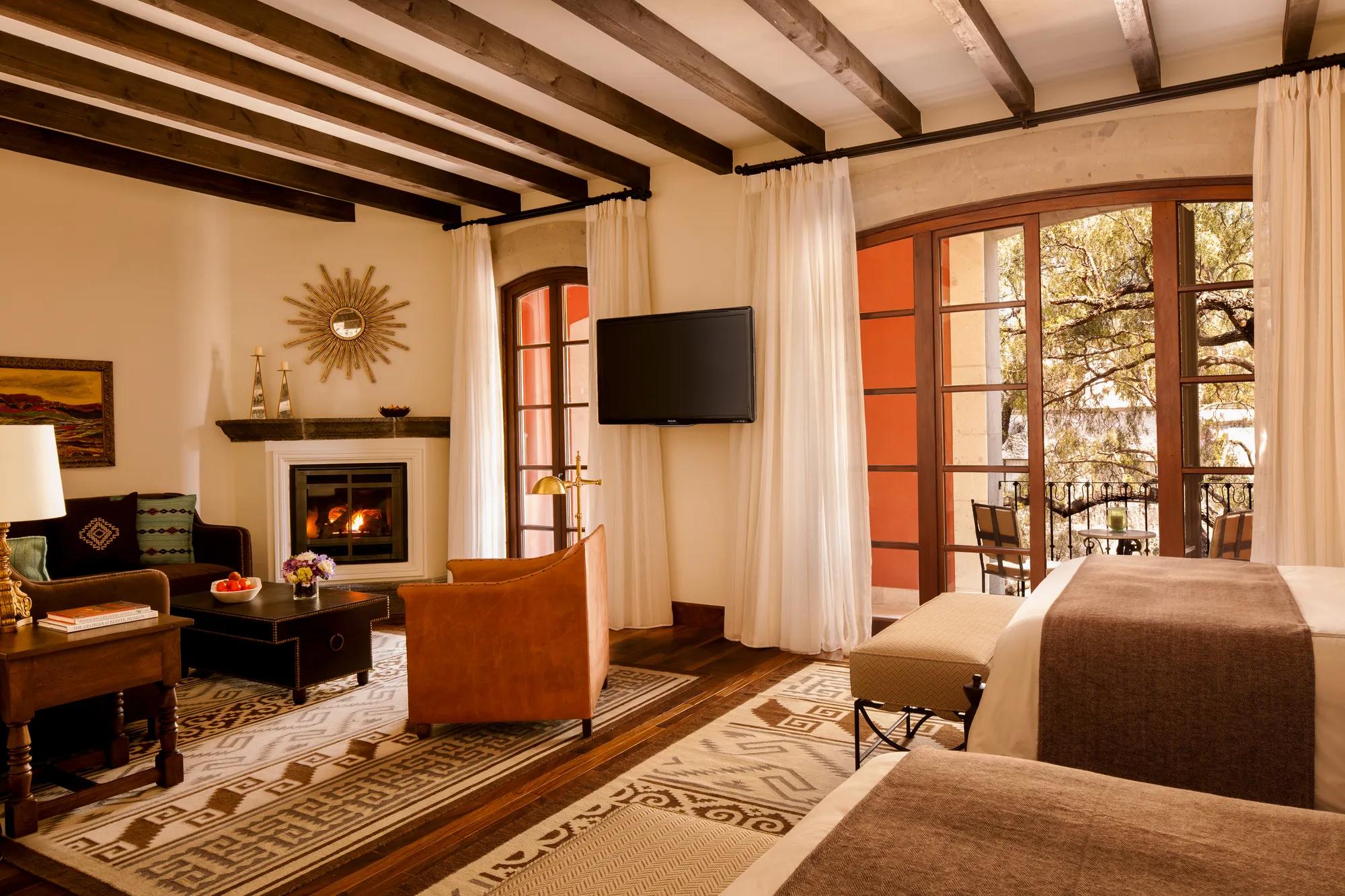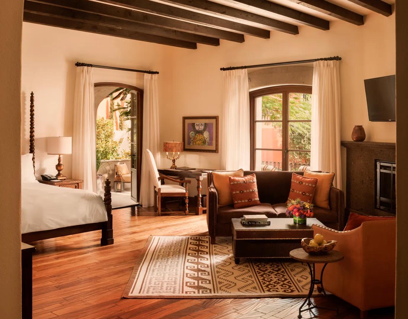 Inspired by the artisans and artists of San Miguel de Allende, the richly appointed Junior Suites offer residential style and elegant decor, including wood floors, natural stone hearths and beautifully curated artwork. The suite comprises of 700 square feet of indoor living space, with one king bed or two queen beds, as well as an outdoor terrace.