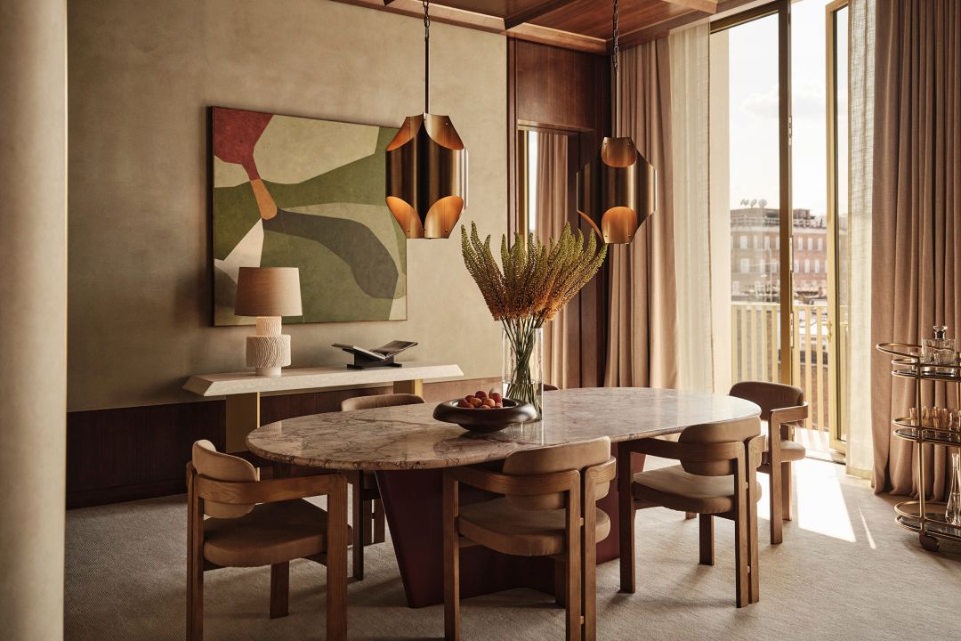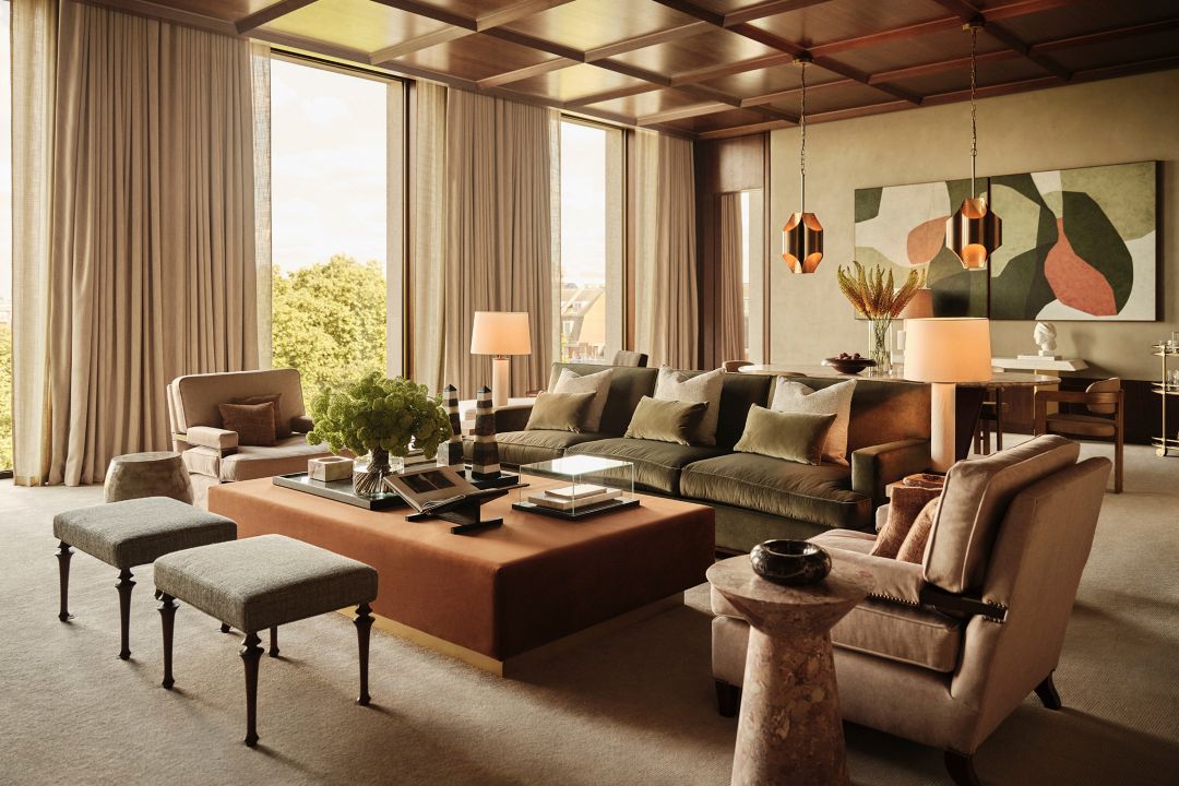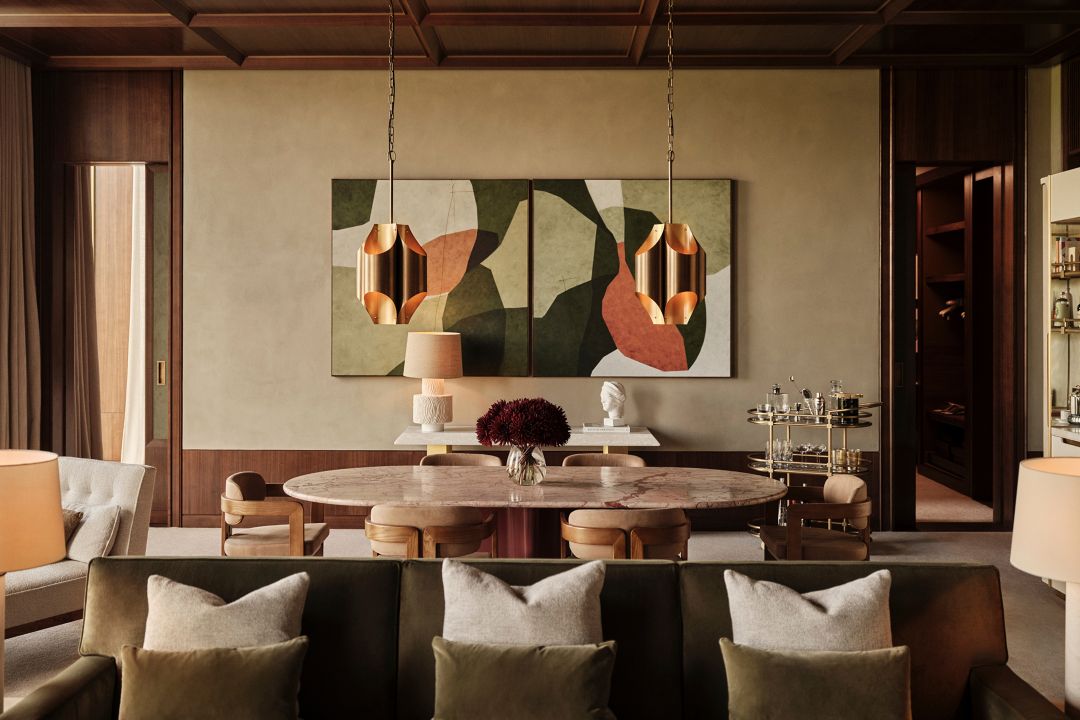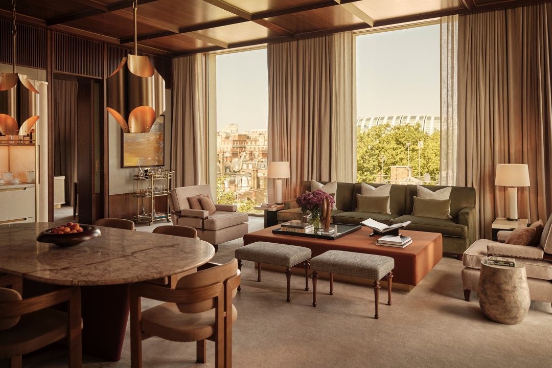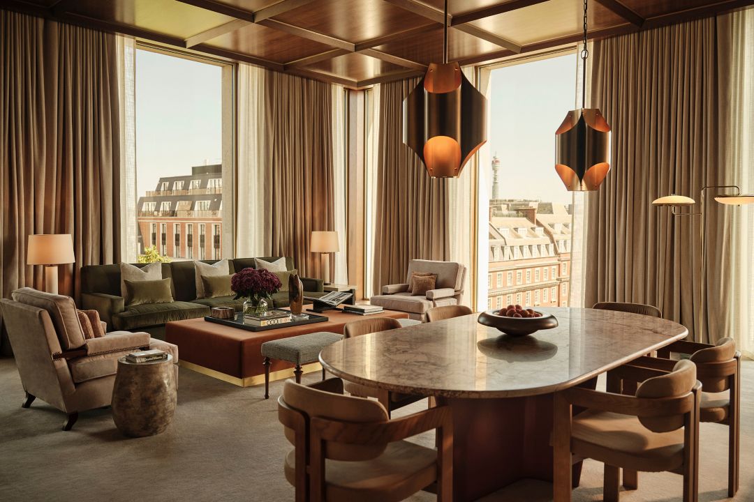 Charles House sits atop The Chancery Rosewood, complete with a panoramic landscaped terrace featuring an outdoor lounge and dining area. Inside, the living room features a grand piano, while the private dining room seats ten. The ante-chamber leading to the master bedroom features a library office looking out onto the city, plus a marble bath with glorious views of the London skyline. Charles House can be complemented by two additional adjoining rooms, reaching a total of 400 square meters.