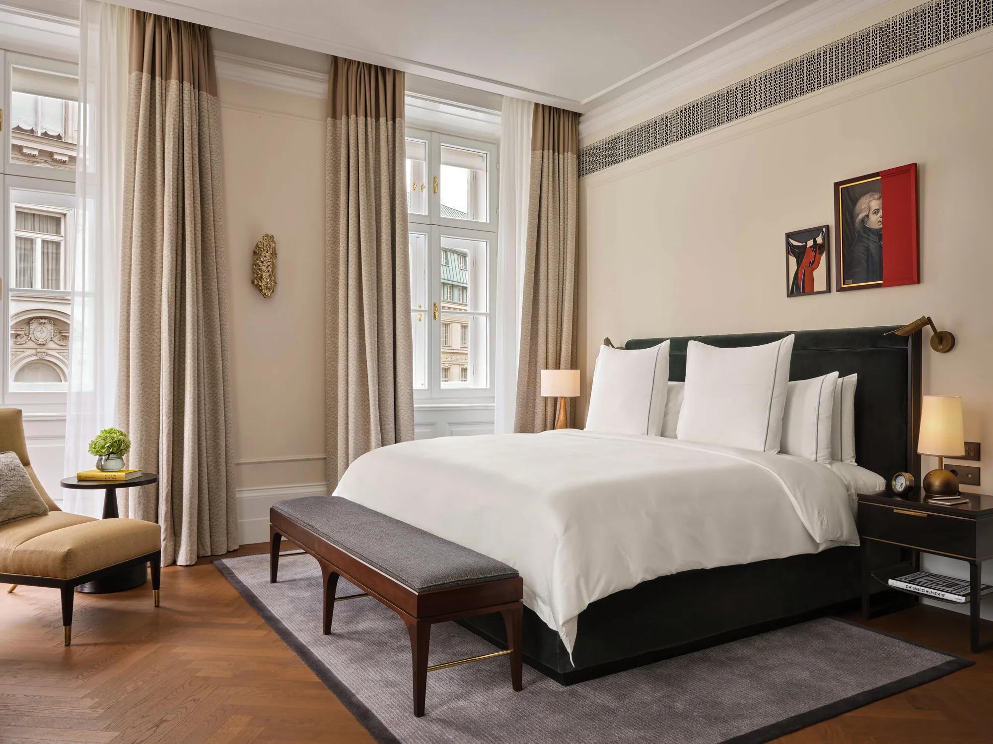 Averaging 60 square metres in size, the Hofburg Suite embodies the contemporary residential style that defines Rosewood Vienna. Situated on the corner of the historic building, the suite benefits from lavish proportions and beautiful views towards Hofburg - the imperial palace of the Habsburg dynasty. Large areas for seating, dining, and entertainment are ideal for business travelers, families, or anyone seeking residential-style accommodations in Vienna. Bespoke furniture, lighting fixtures, and fabrics enhance the distinctiveness of these luxurious suites. For additional space, Hofburg Suite may be connected to a Premier King room.
