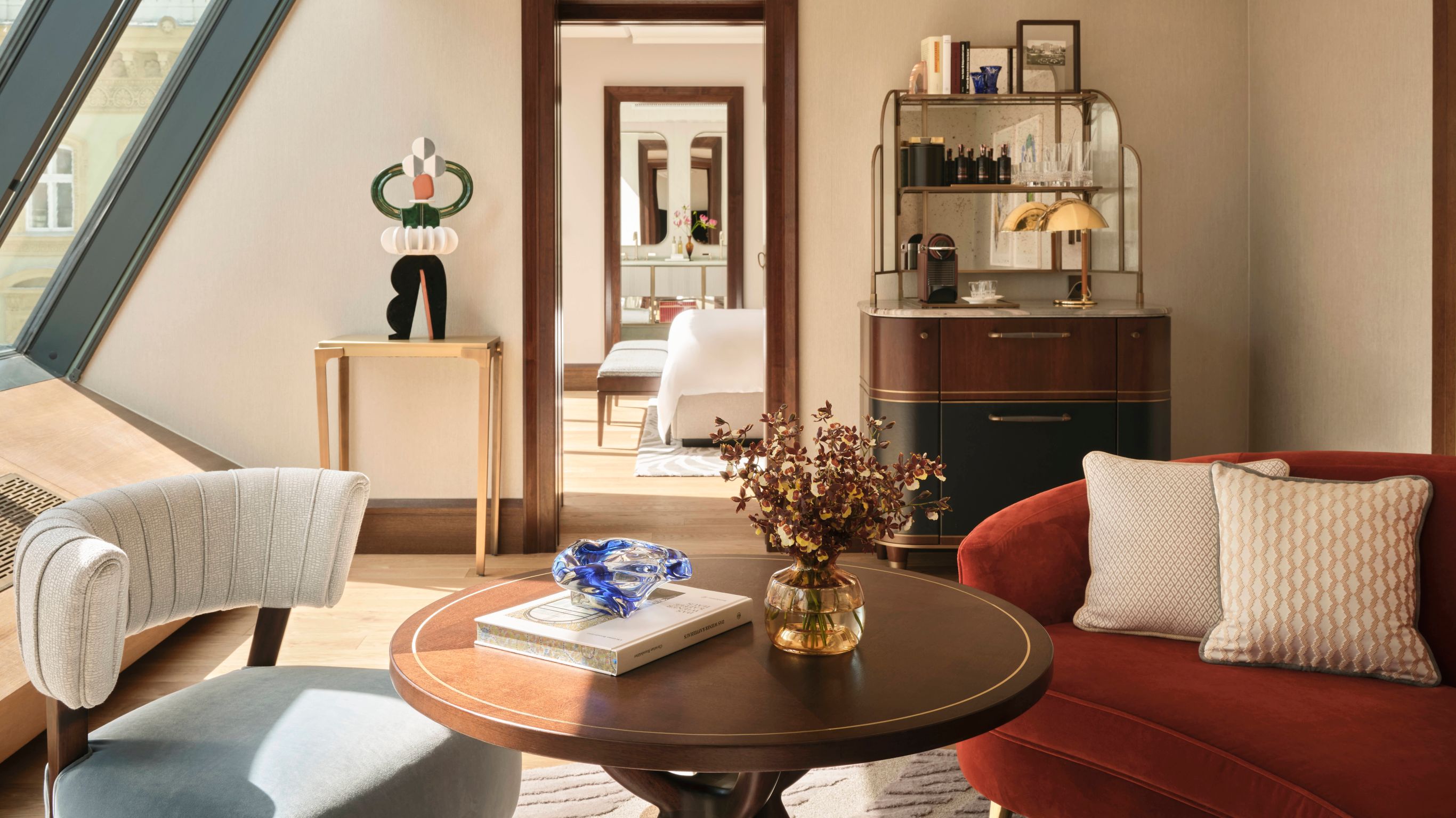 A remarkable, loft-like one-bedroom suite, the St. Peter’s Suite is distinguished by its uniquely canted, floor-to-ceiling windows that provide a breathtaking, direct view of Peterskirche — one of Vienna’s most celebrated Baroque landmarks — from both the bedroom and the living room. Bespoke furniture, local artworks, and elegant lighting fixtures reflect contemporary Vienna, and the spacious 61 sq.m. (656 sq. ft.) layout offers residential-style comfort for your sojourn in the city.