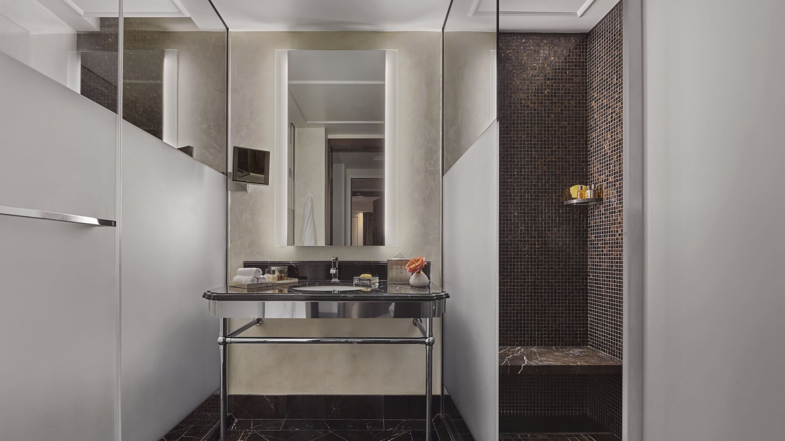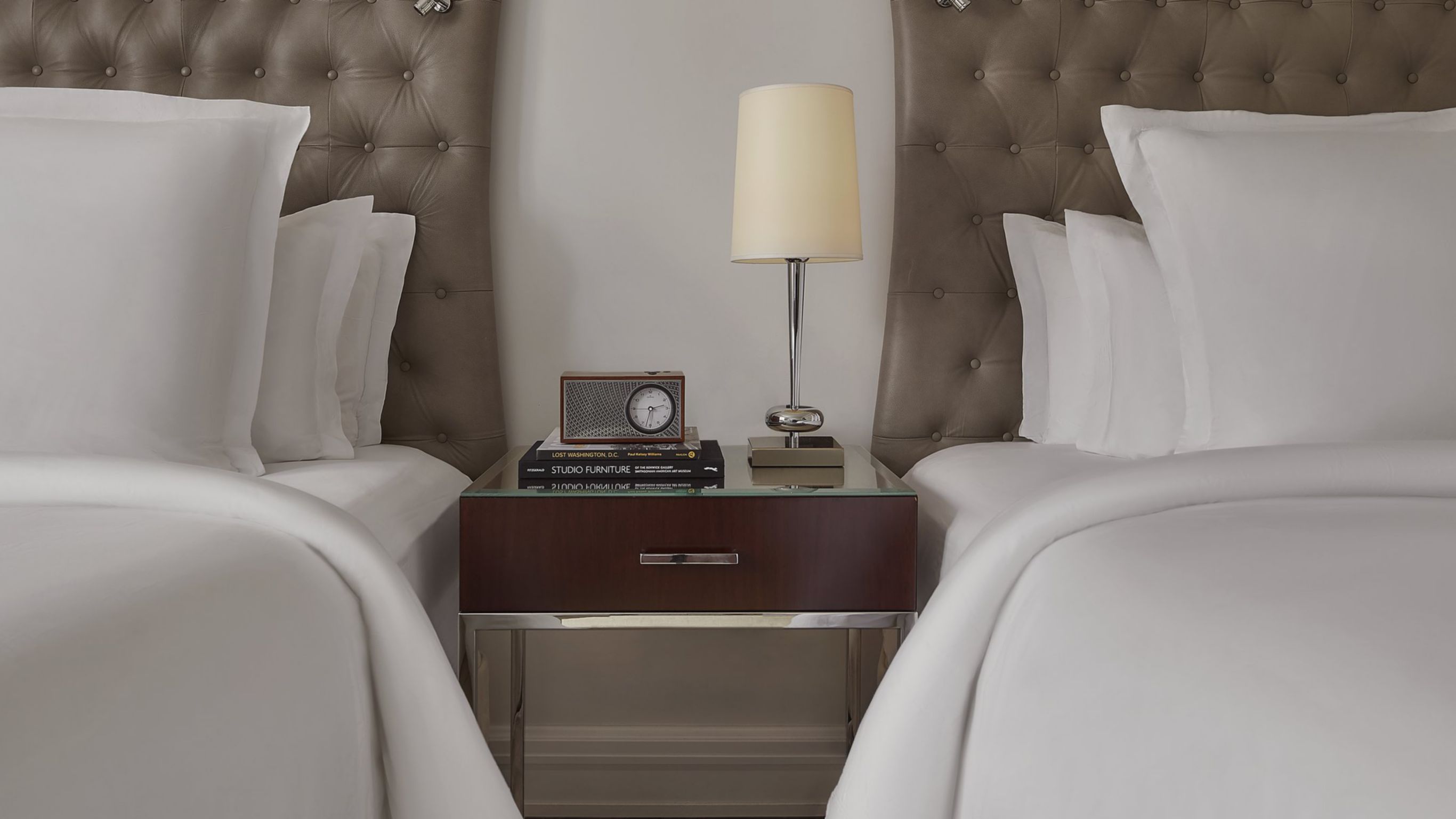 The spacious Deluxe Double Room features two full-size beds, separate sitting area, comfortable desk, glass-enclosed floor-to-ceiling rainfall shower and lovely views of historic Georgetown.