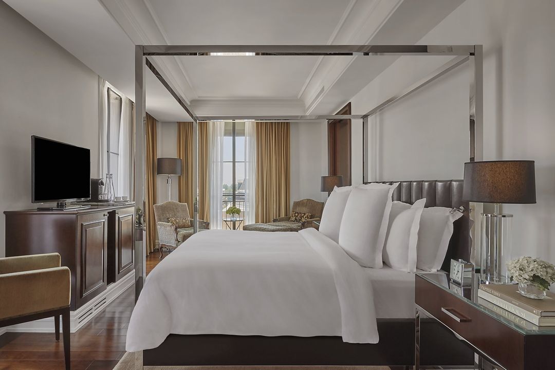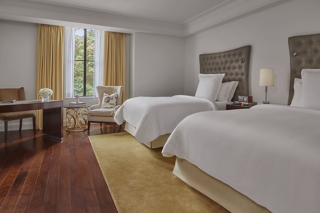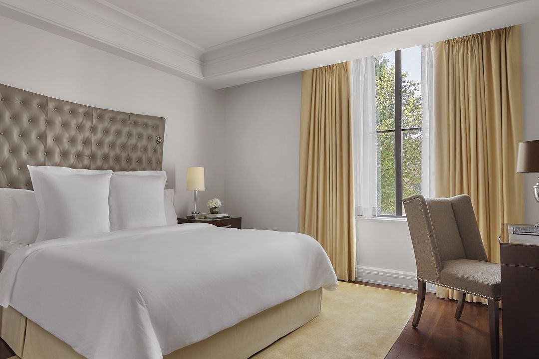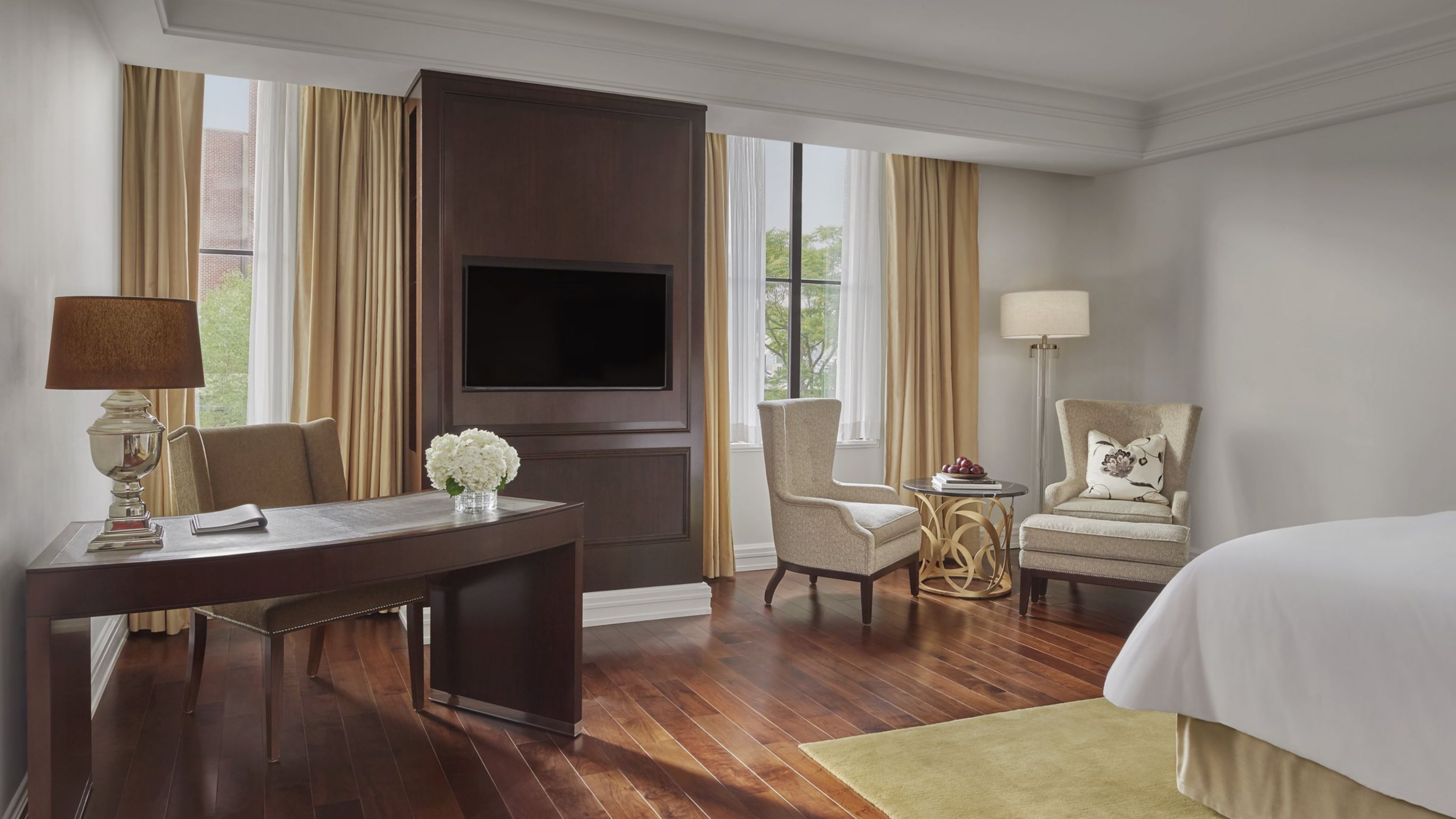 The spacious Deluxe King Room features a king-size bed, separate sitting area, comfortable desk, glass-enclosed floor-to-ceiling rainfall shower, luxurious standalone soaking tub and lovely views of historic Georgetown.