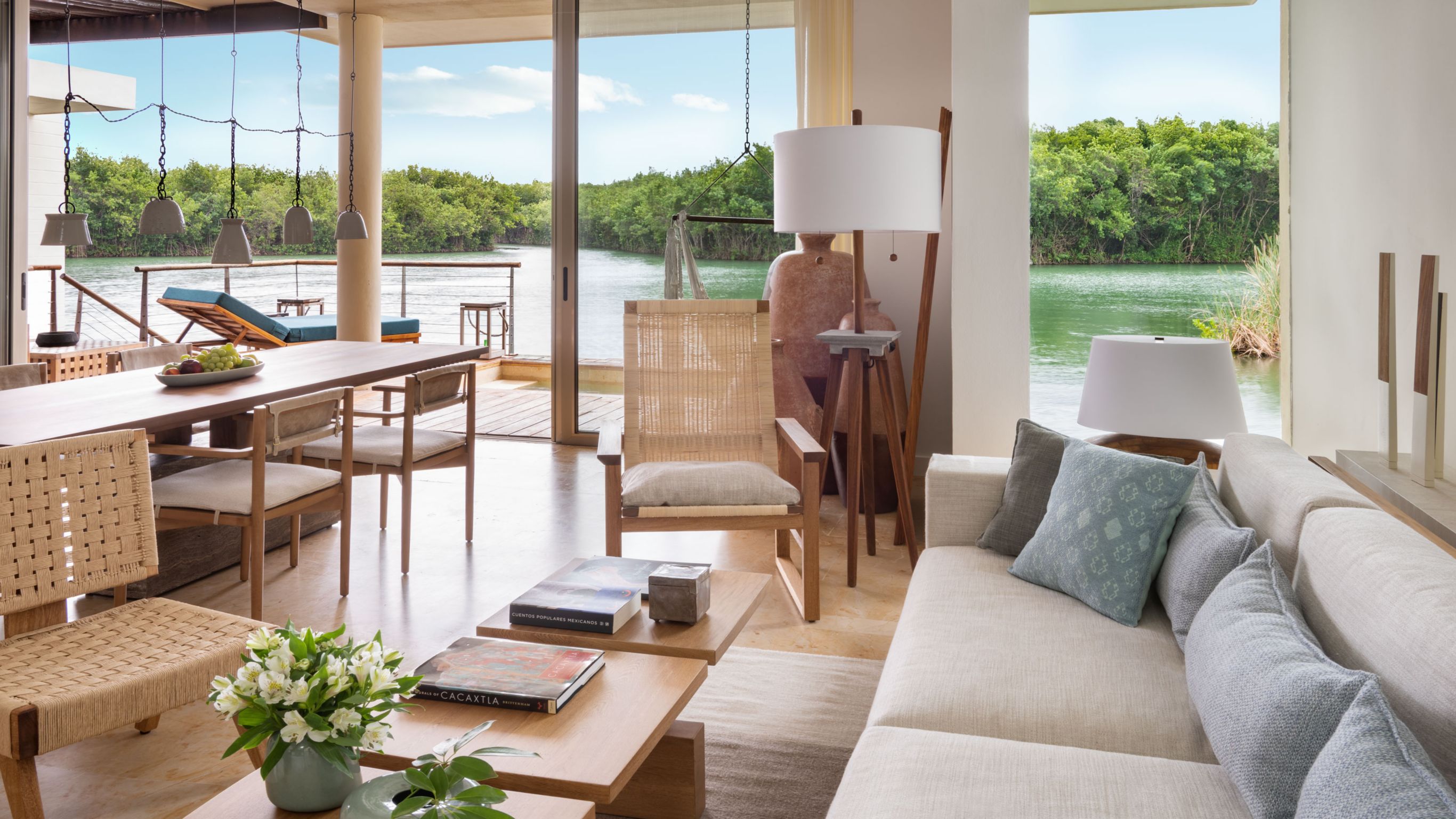 Como una imagen perfecta, esta suite emerge con gracia sobre las aguas esmeralda de la laguna. Este alojamiento único en su tipo ofrece una acogedora terraza con relajante piscina, lujoso baño con ducha al aire libre, un vestidor privado y vistas espectaculares de la laguna y los manglares. Es ideal para recién casados y parejas. Este alojamiento único en Playa del Carmen ofrece una acogedora terraza con piscina profunda, un lujoso baño con ducha al aire libre, un vestidor, una cama king y espectaculares vistas de la laguna y de los manglares.