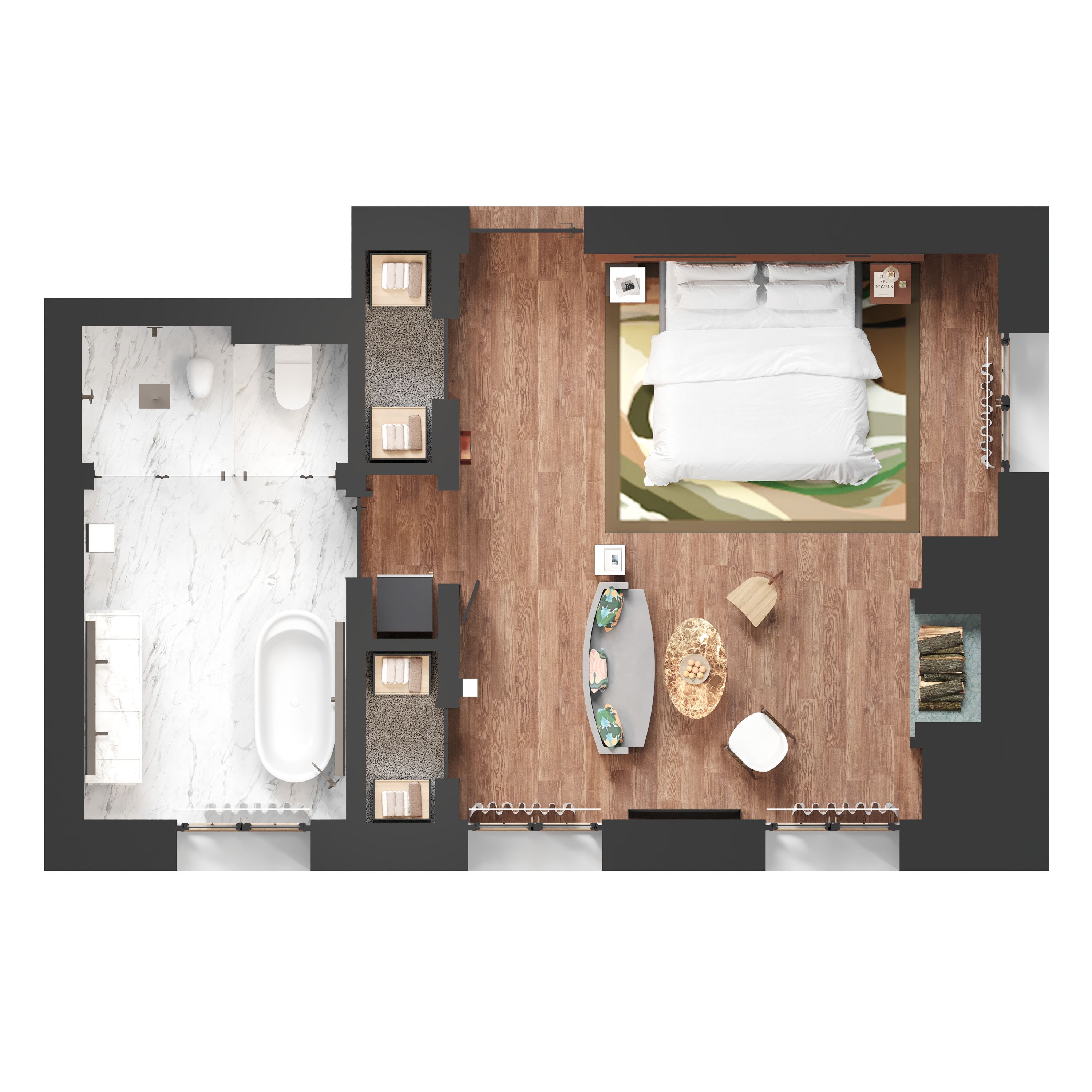 Projetada com a sofisticação de uma residência decorada, a charmosa Junior Suite oferece intimidade em um espaço aberto com uma cama king-size e área de estar com lareira.