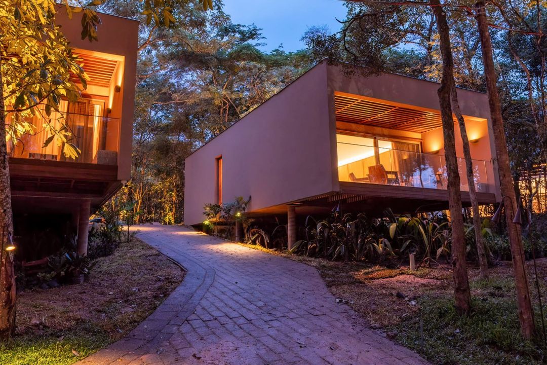 Com uma estrutura integrada ao cenário natural, o lodge oferece acomodações charmosas, onde materiais sustentáveis e design acolhedor se combinam para proporcionar descanso e imersão. Chalés, bangalôs envidraçados e quartos panorâmicos se espalham entre a mata, com varandas, redes, banheiras e vistas para a floresta. Ao redor, lounges abertos, um bar flutuante sobre o rio, piscinas de borda infinita e um restaurante rodeado por verde criam o ambiente ideal para contemplação e tranquilidade.