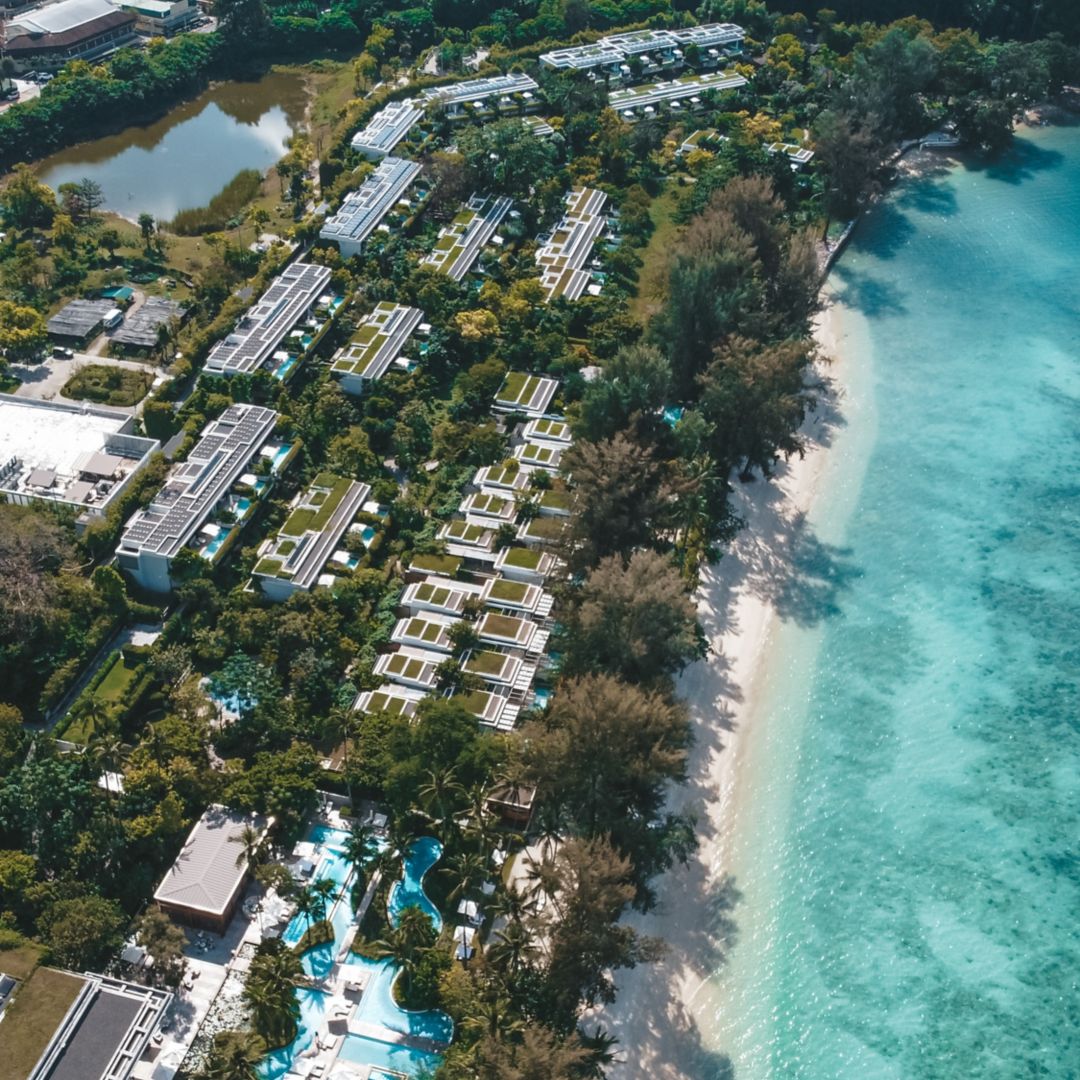 酒店新颖别致而注重环保的建筑设计融入婉约而含蓄的环境元素,石材和木材全部就地取材,加上落地窗设计,让宾客时刻沉浸在大自然的美景之中。酒店设计同时融入了可持续因素,包括建设为整个酒店提供水源的雨水收集池,还有为普吉岛上酒店供电的大型可再生太阳能系统,以及有利于保护生态的“屋顶庭院”。