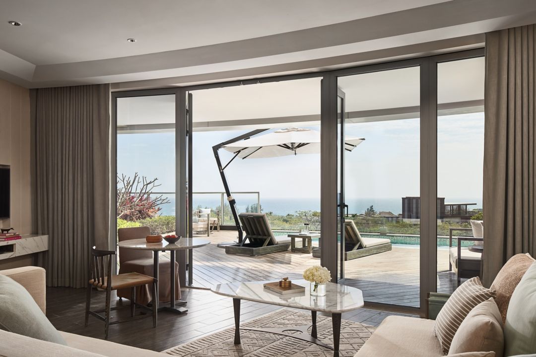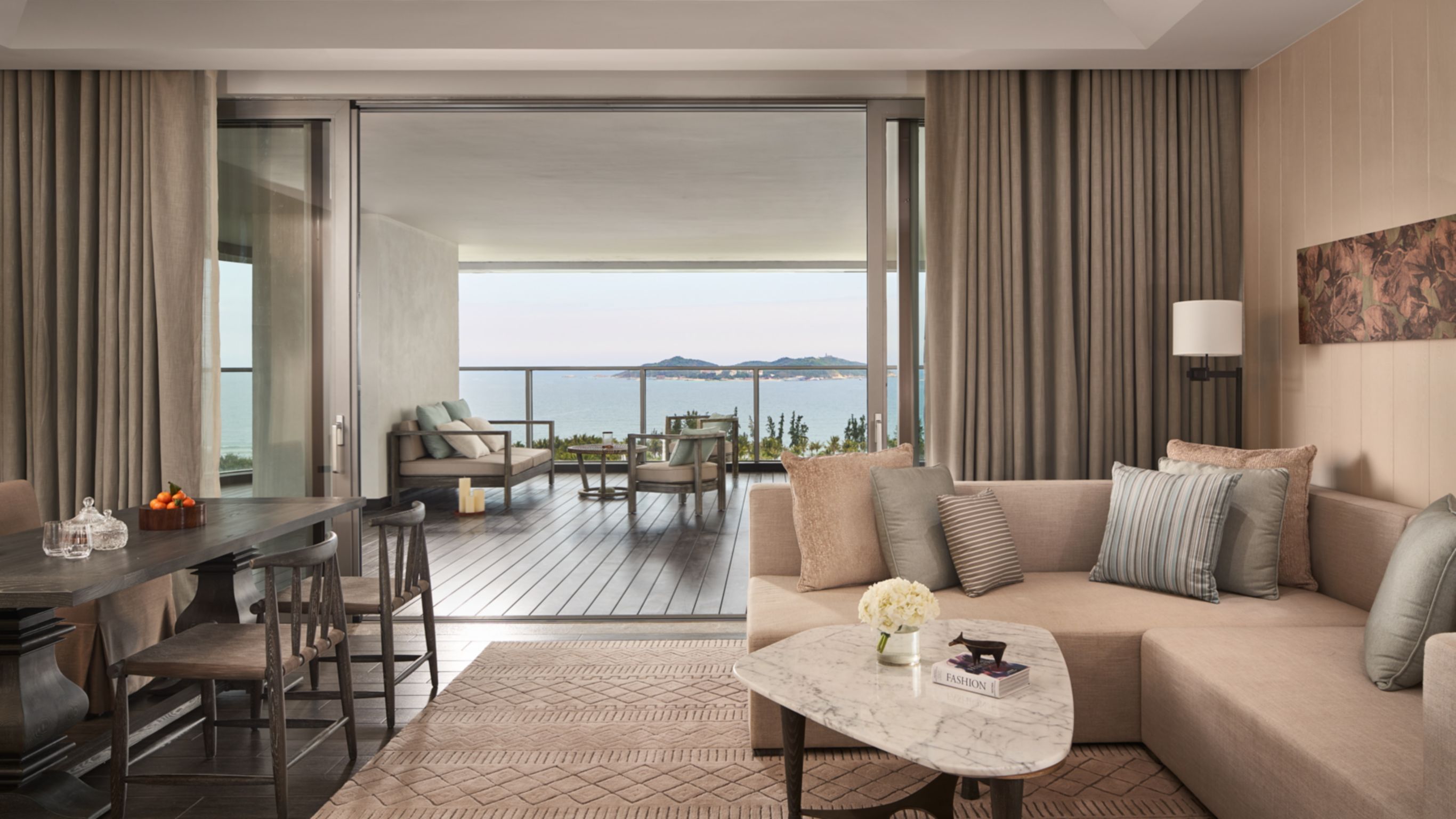 豪华海景套房拥有宫殿般的居住空间,设有私密的卧室,步入式衣帽间,客用浴室以及配备桌椅的独立起居室,是这片热带天堂住宅式居停的完美示范。套房的超大浴室设有浴缸以及双盥洗池,增添一抹奢华韵味。放眼一览无余的南中国海自然美景,冷色调石材装饰和触感完美的房间俨然一所天堂般的避风港。豪华海景套房位于酒店 3 层至 5 层。
